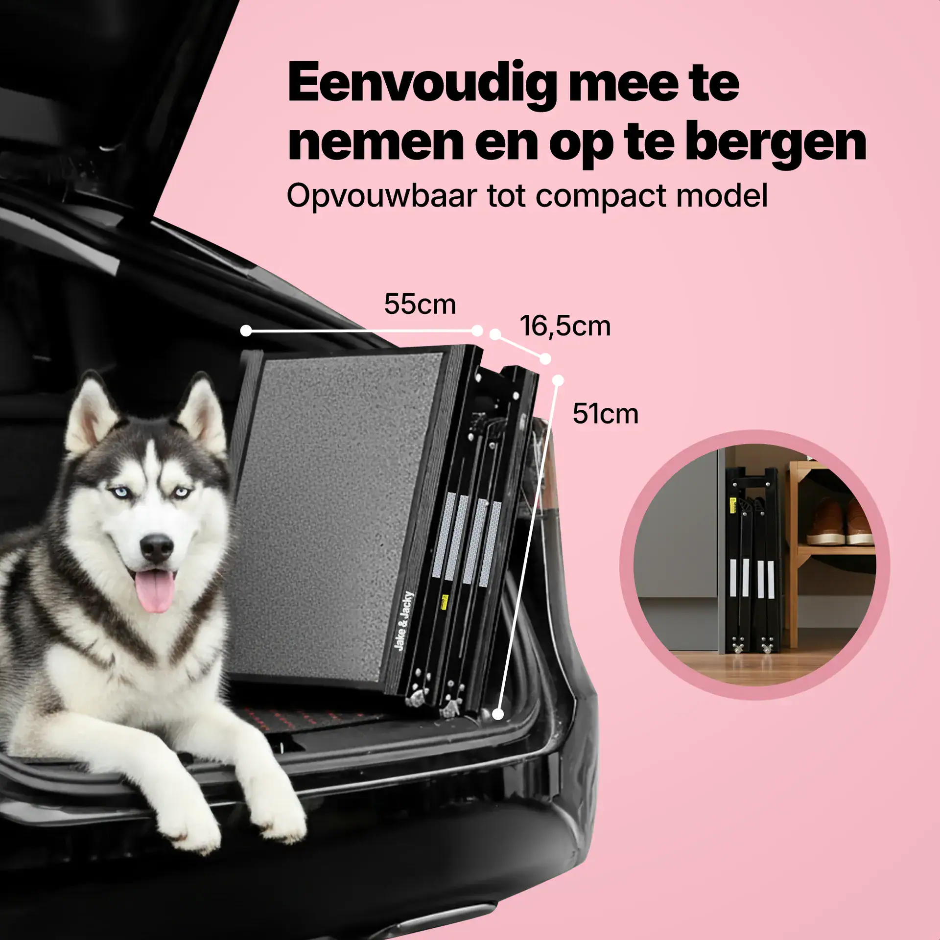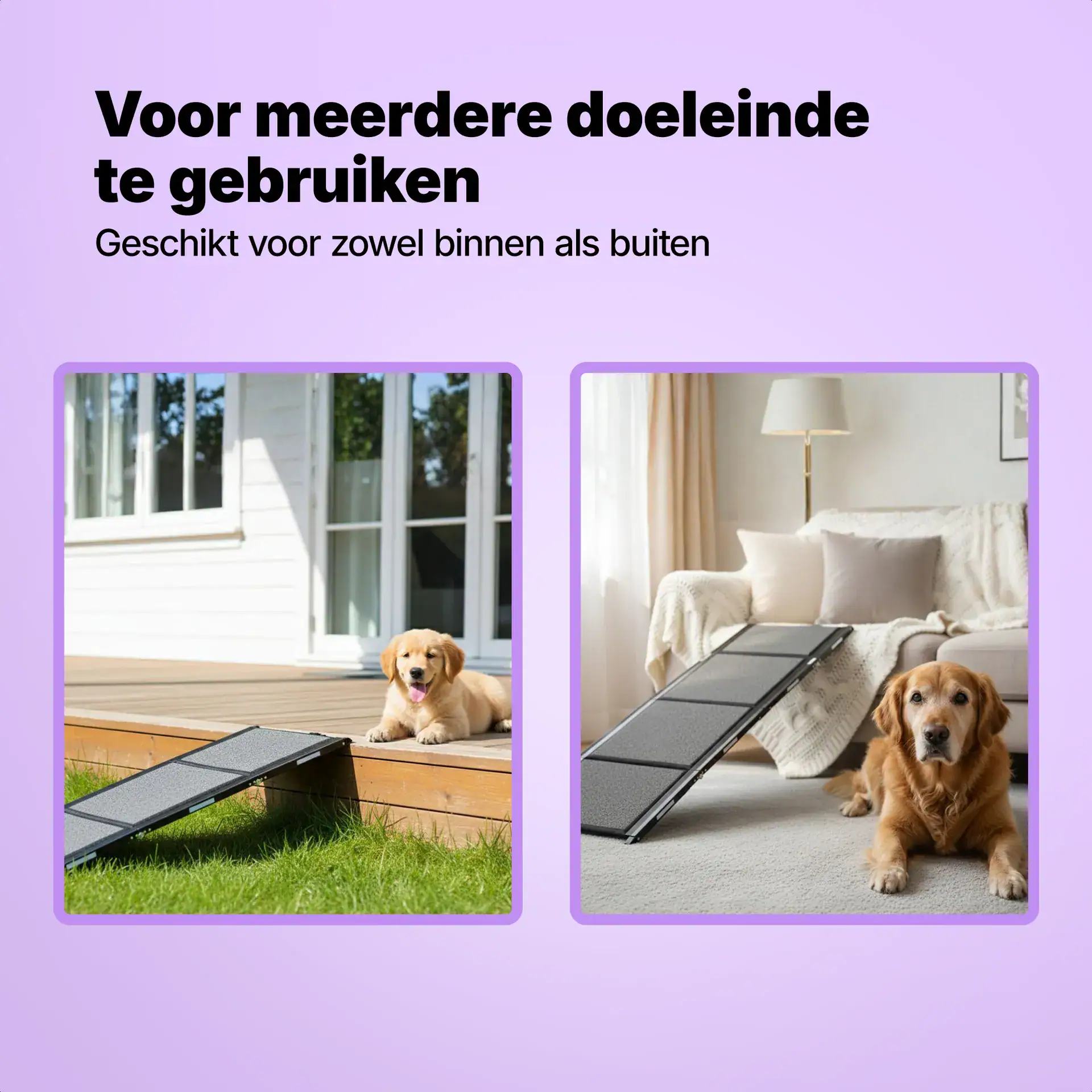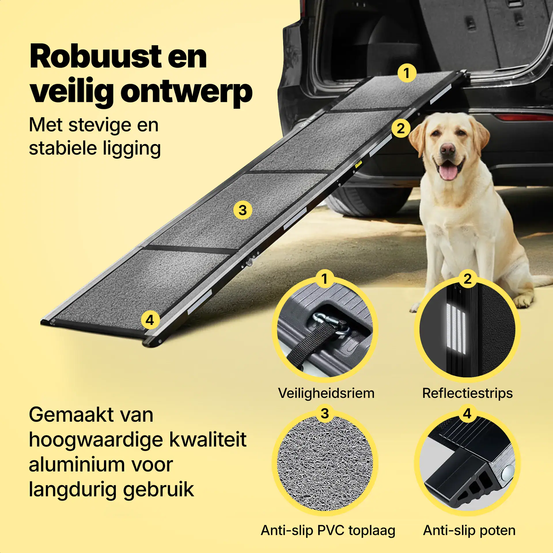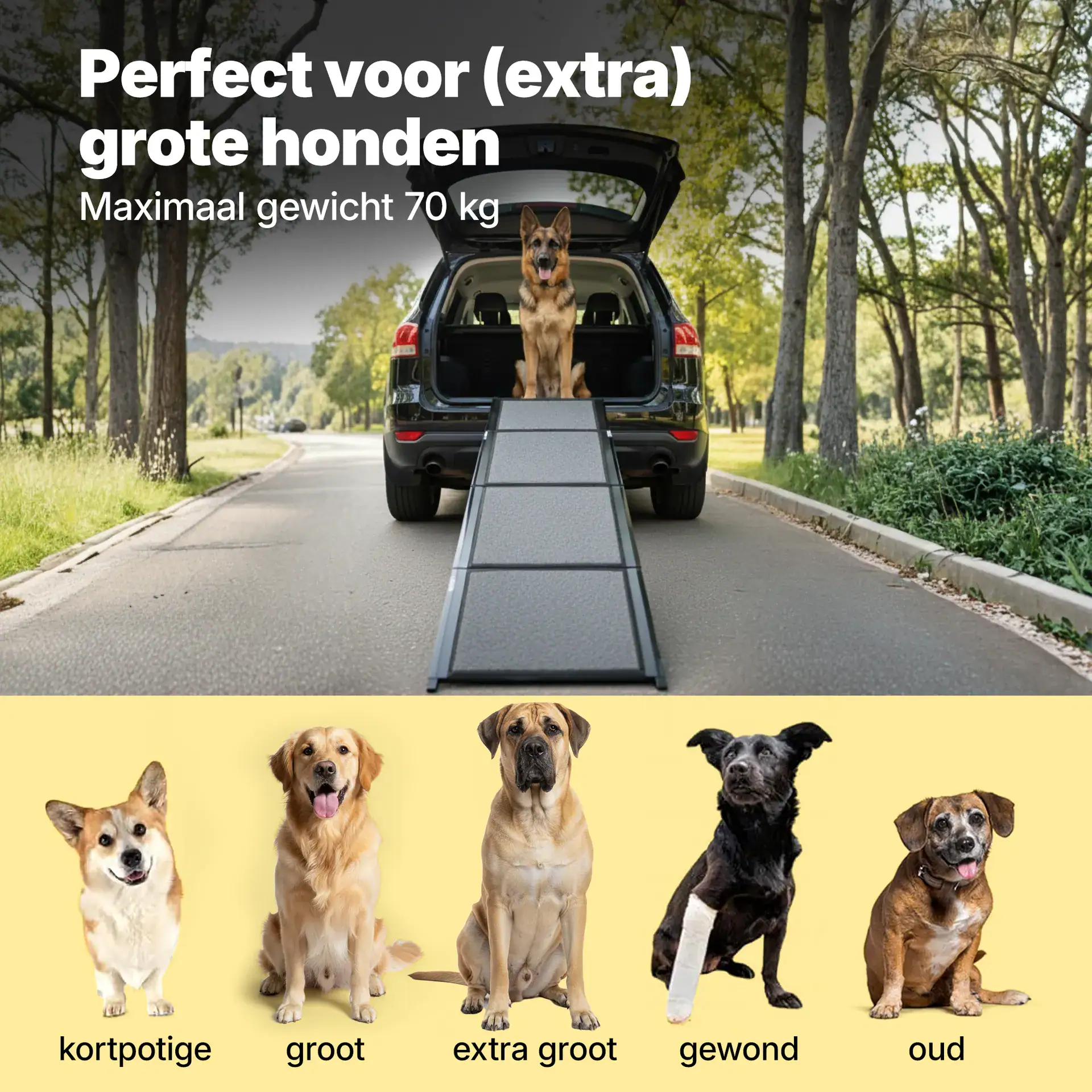 Onze hondenloopplank is speciaal ontworpen om het in- en uit de auto stappen van jouw hond(en) makkelijker te maken en zo gewricht, pees en spierproblemen te voorkomen. De loopplank is ideaal voor honden op leeftijd, honden met bestaande gewrichtsproblemen maar juist ook voor jonge honden om gewrichtsproblemen in de toekomst te voorkomen.