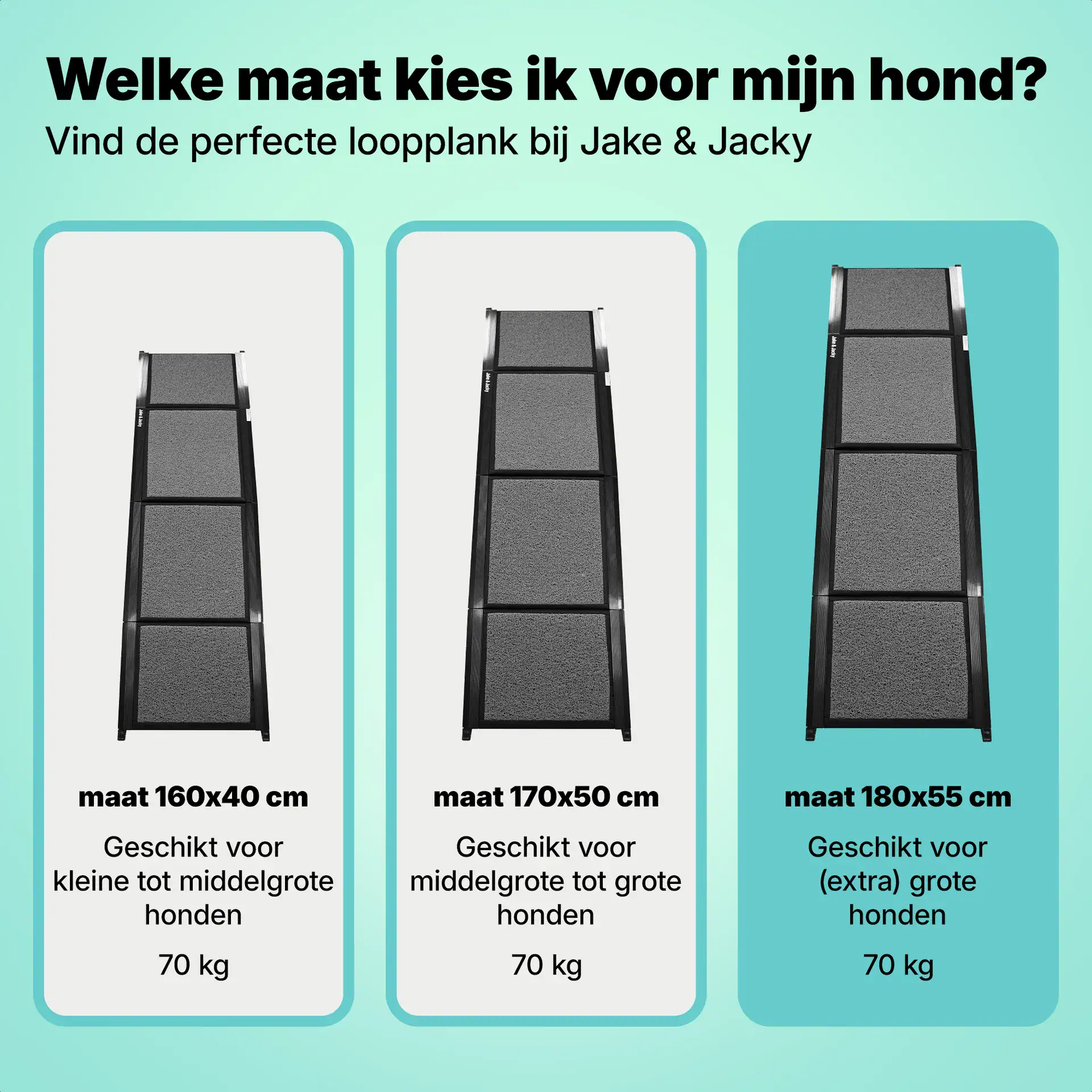 Wij hebben ervoor gekozen om 3 maten aan te bieden, dit in tegenstelling tot andere aanbieders. De meeste loopplanken hebben een breedte van 40 cm en een lengte van 160 cm wat voor kleine honden prima is, maar voor grotere honden te smal en te kort, waardoor de helling erg steil is. Wij hebben gekozen voor optimaal comfort passende bij jouw hond met variërende lengtes en breedtes.