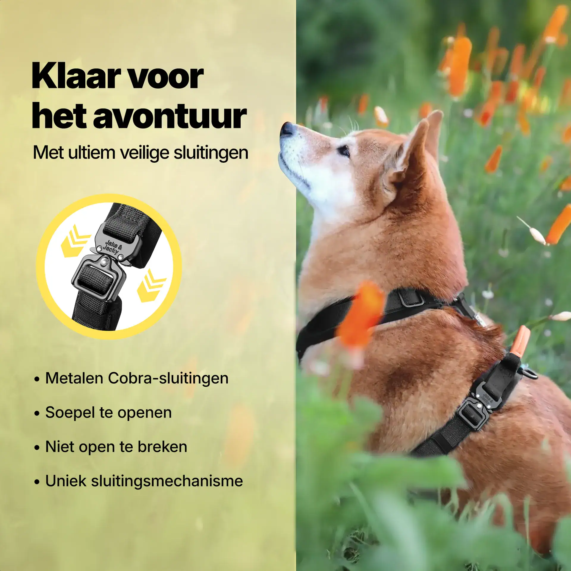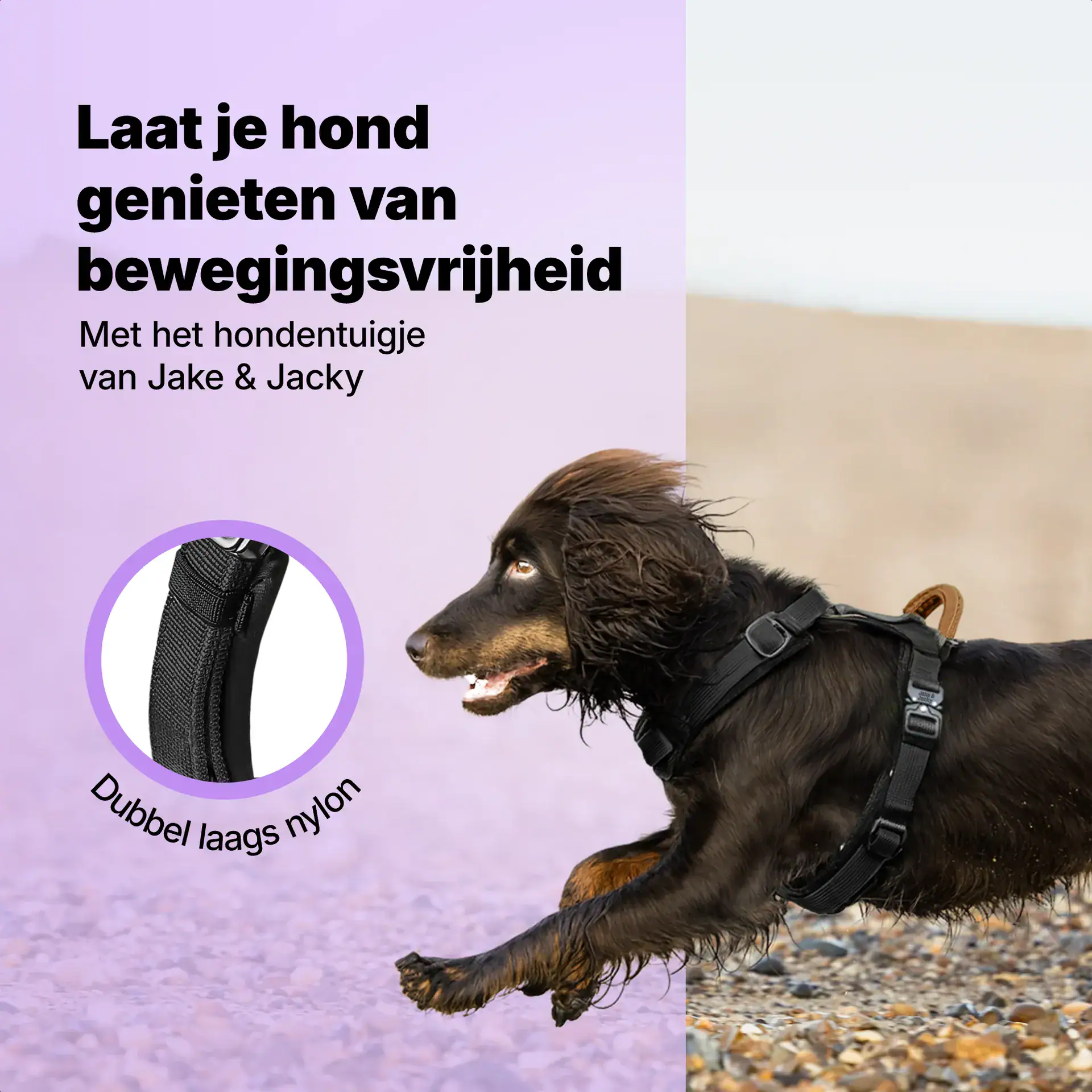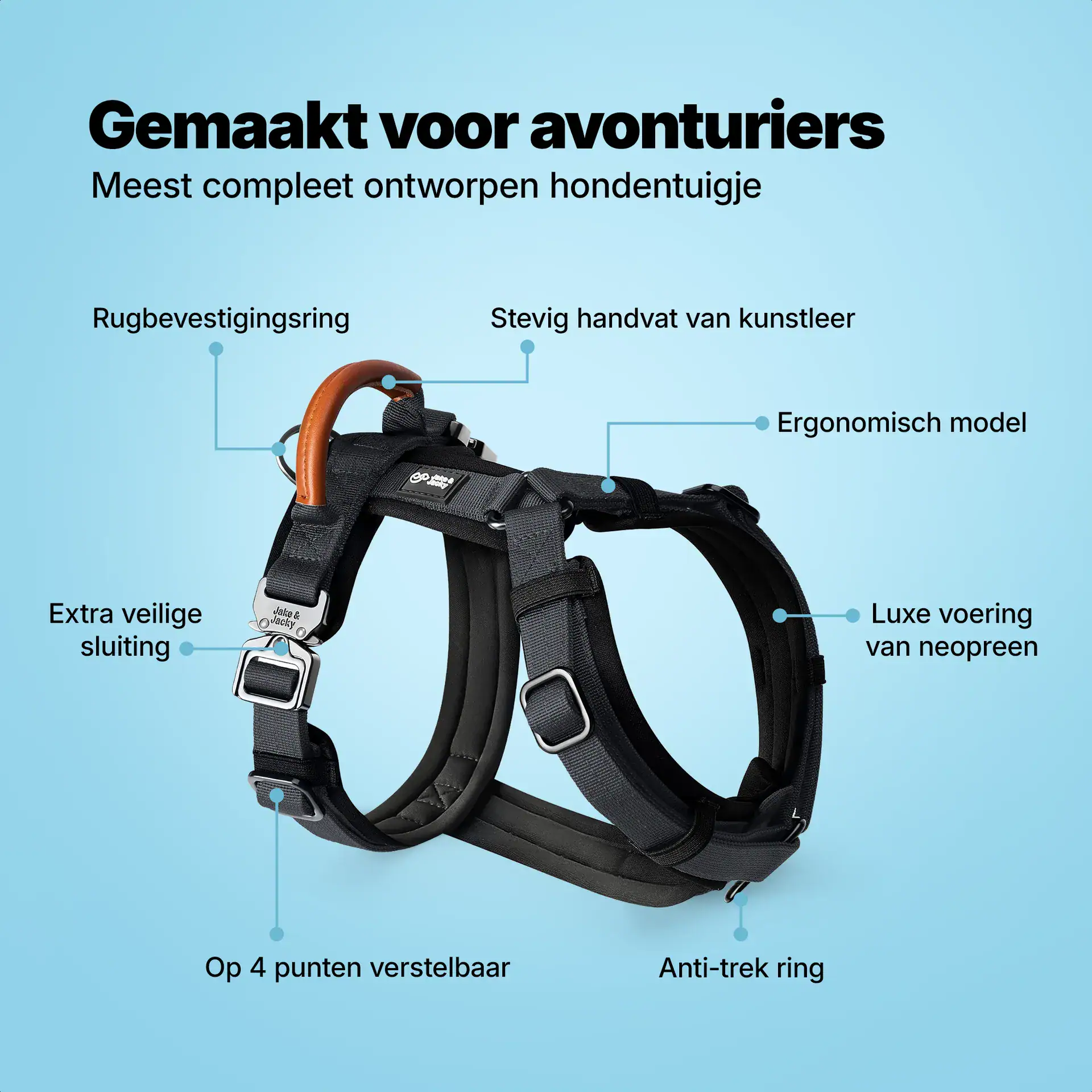 Gaan jij en je viervoeter ook graag op avontuur en zijn jullie op zoek naar ultiem wandel én draagcomfort? Kies dan voor dit superfijne ergonomische tuigje van Jake & Jacky. Het tuigje is gemaakt van hoogwaardige materialen voor een lange levensduur. De binnenlaag is gevoerd met een dikke laag neopreen voor maximaal draagcomfort voor jouw harige vriend. Het Y-model geeft volledige bewegingsvrijheid wat spier en gewrichtsproblemen voorkomt. Tevens is het tuigje afwerkt met onze bekende antitrek ring aan de borstzijde voor extra wandelplezier voor de baas bij trekgrage honden.