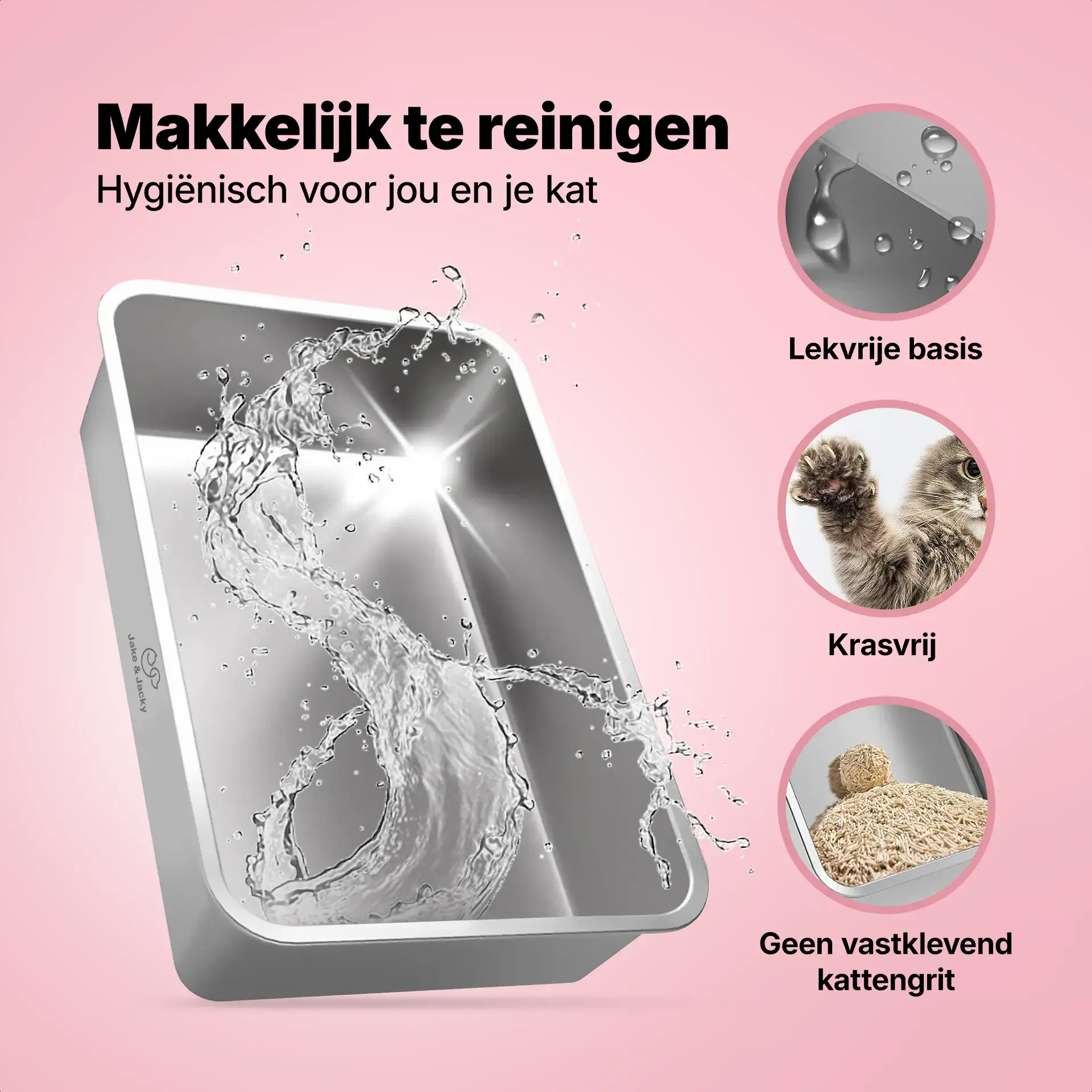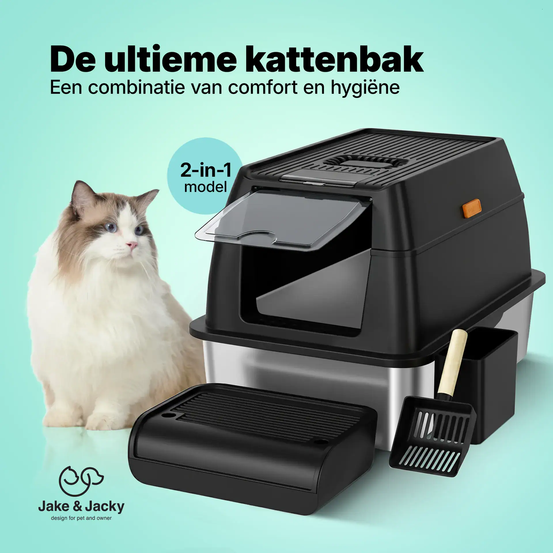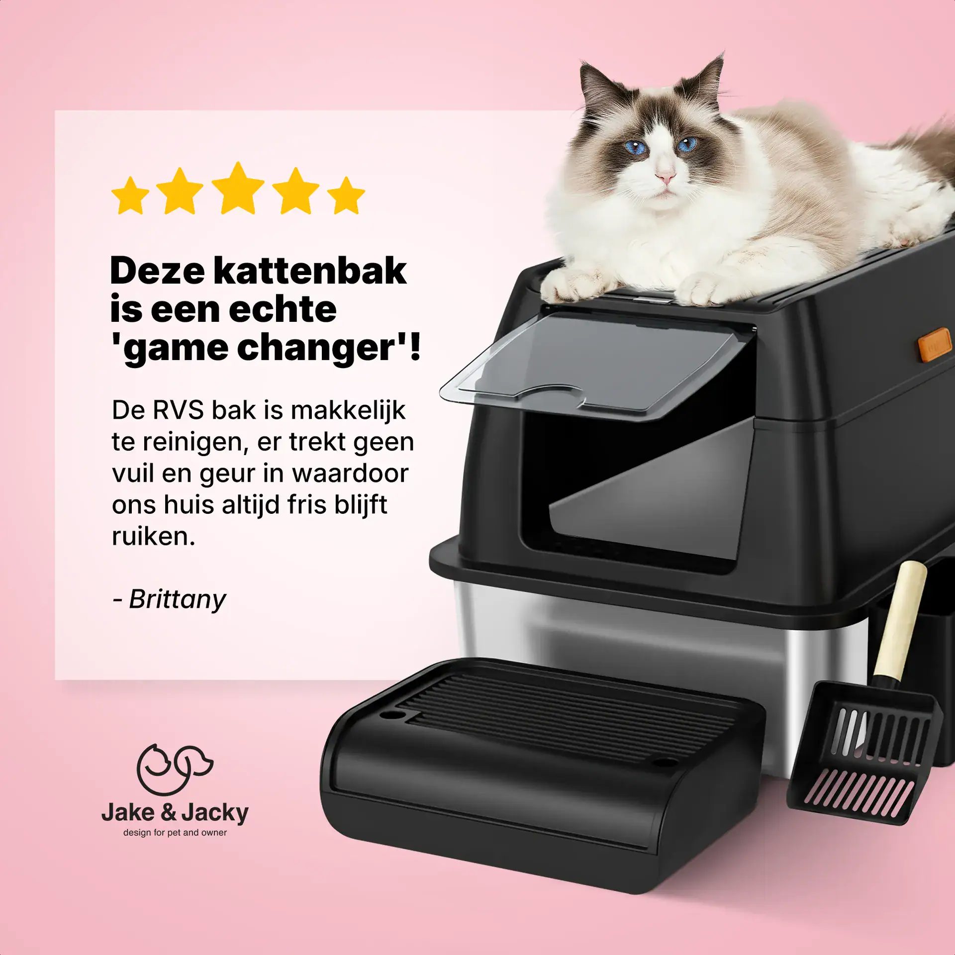 Ben jij vieze kattenbak geurtjes ook zo zat? En ben je op zoek naar een kattenbak die makkelijk schoon te maken is, een lange levensduur heeft en een fijne plek biedt voor jouw kat? Dan is onze innovatieve RVS-kattenbak van Jake & Jacky een uitkomst. Onze kattenbak is gemaakt van RVS, welke bestand is tegen krassen en slijtage. Dit voorkomt de typische kattenbak geur zoals bekend bij kunststof varianten. Met de afneembare deksel kun je er ook een open kattenbak van maken. Het gritopvang opstapje maakt het jouw kat extra makkelijk om naar binnen- en buiten te stappen zonder dat het huis onder het kattengrit ligt.