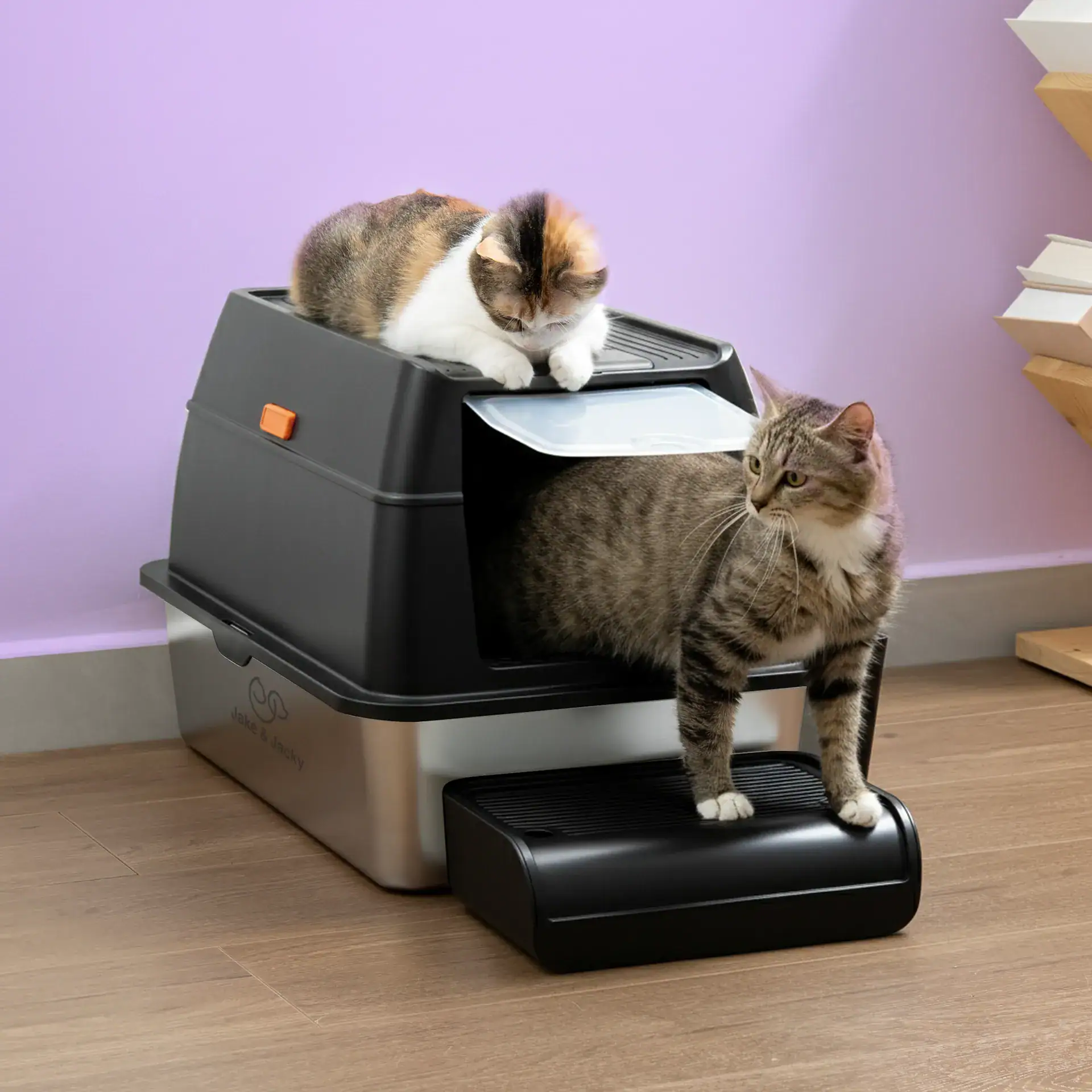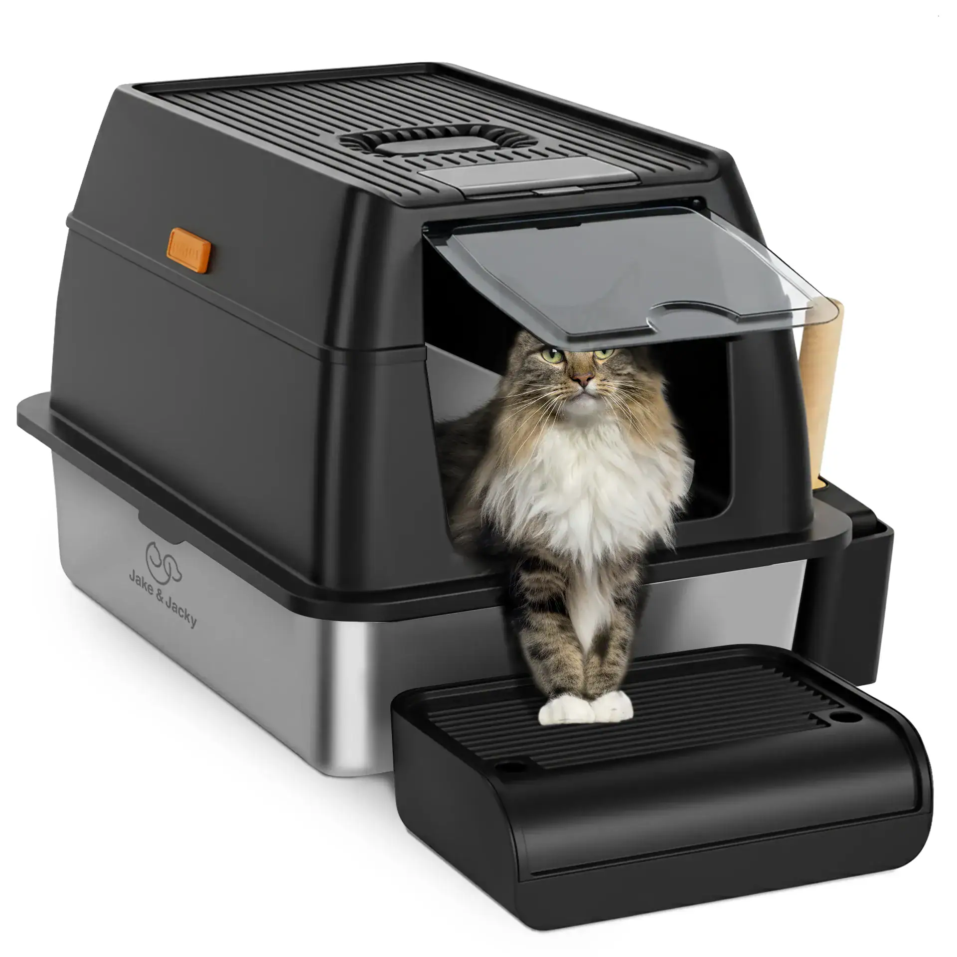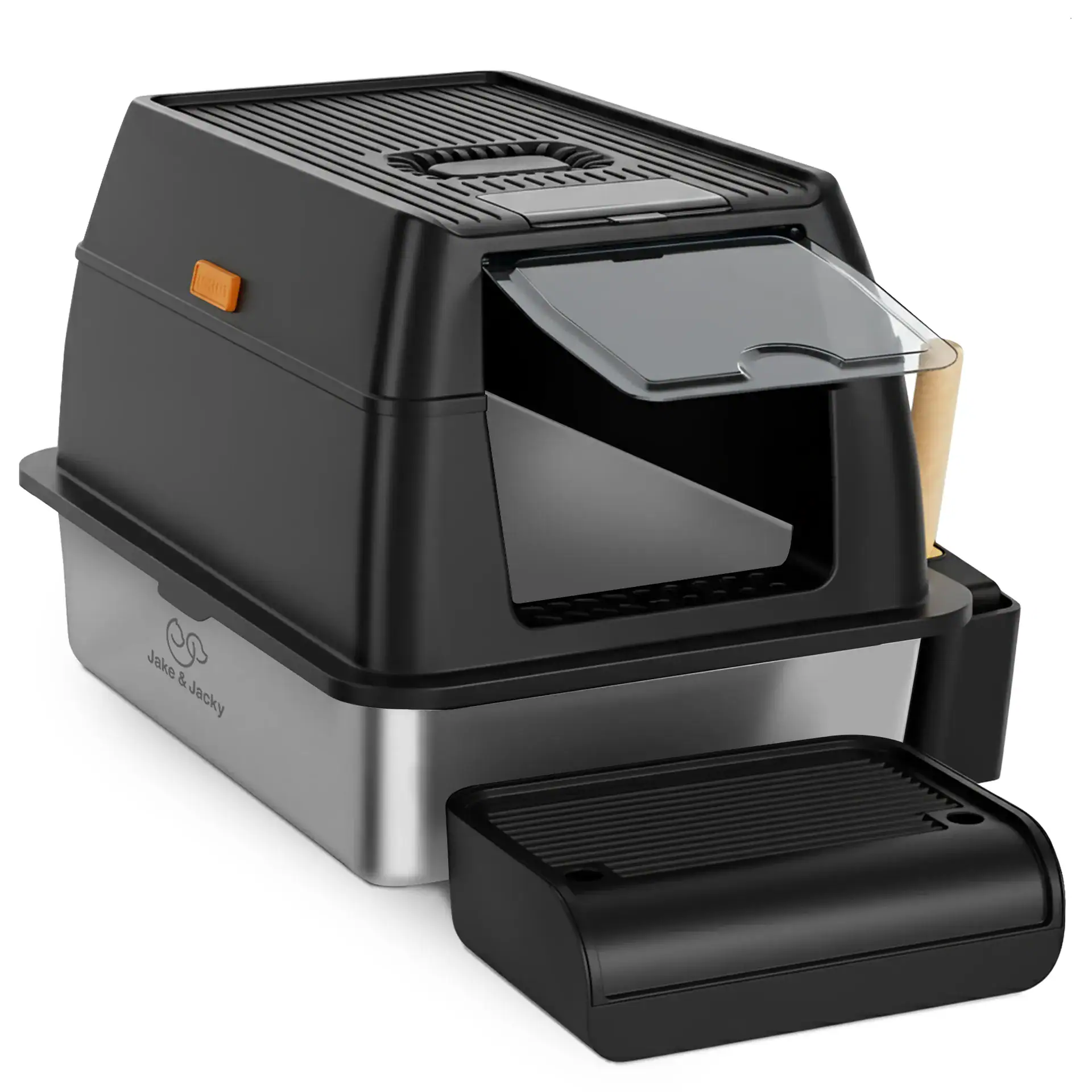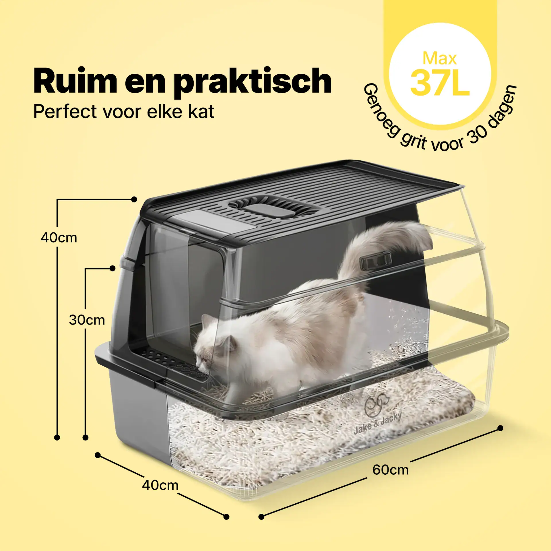 Ben jij vieze kattenbak geurtjes ook zo zat? En ben je op zoek naar een kattenbak die makkelijk schoon te maken is, een lange levensduur heeft en een fijne plek biedt voor jouw kat? Dan is onze innovatieve RVS-kattenbak van Jake & Jacky een uitkomst. Onze kattenbak is gemaakt van RVS, welke bestand is tegen krassen en slijtage. Dit voorkomt de typische kattenbak geur zoals bekend bij kunststof varianten. Met de afneembare deksel kun je er ook een open kattenbak van maken. Het gritopvang opstapje maakt het jouw kat extra makkelijk om naar binnen- en buiten te stappen zonder dat het huis onder het kattengrit ligt.