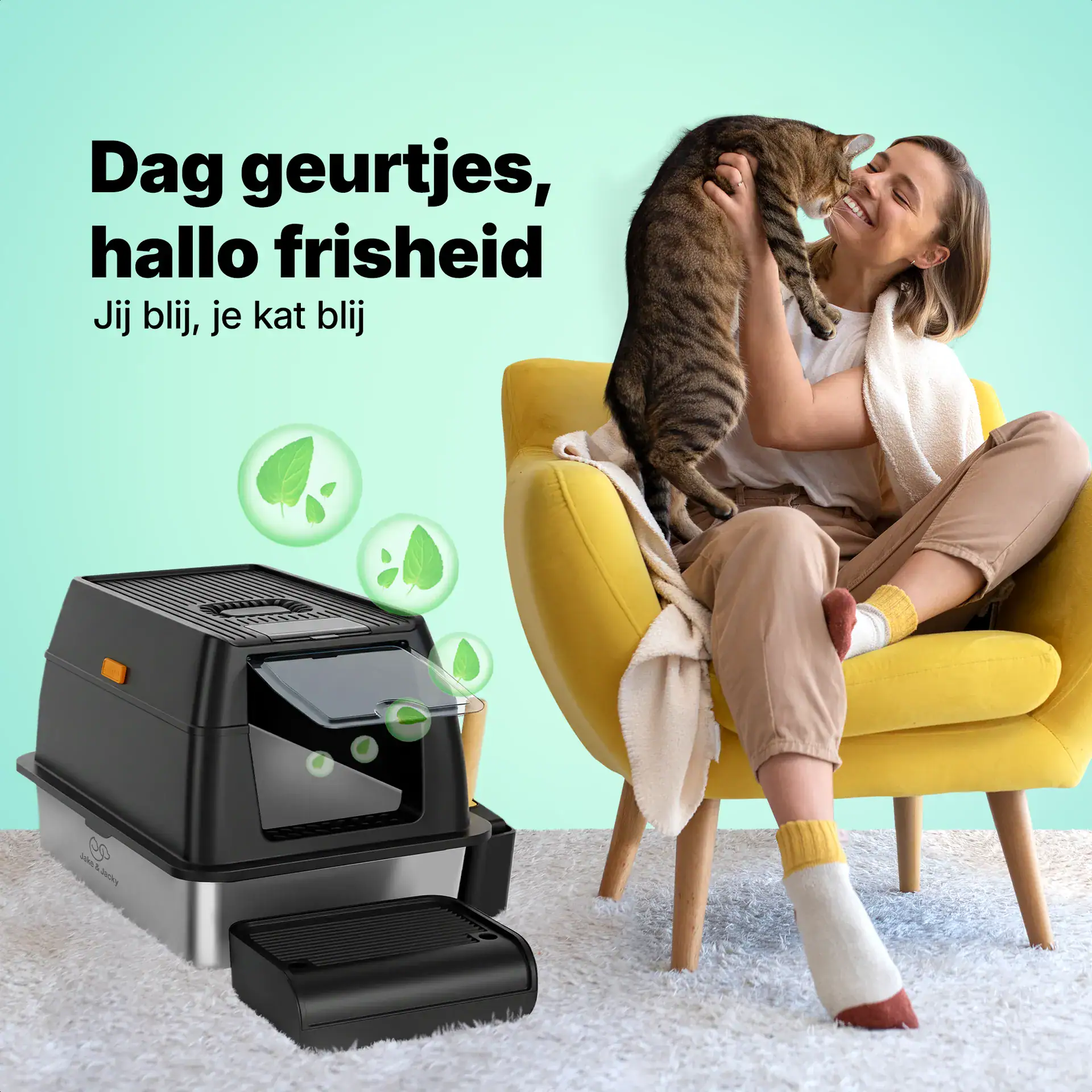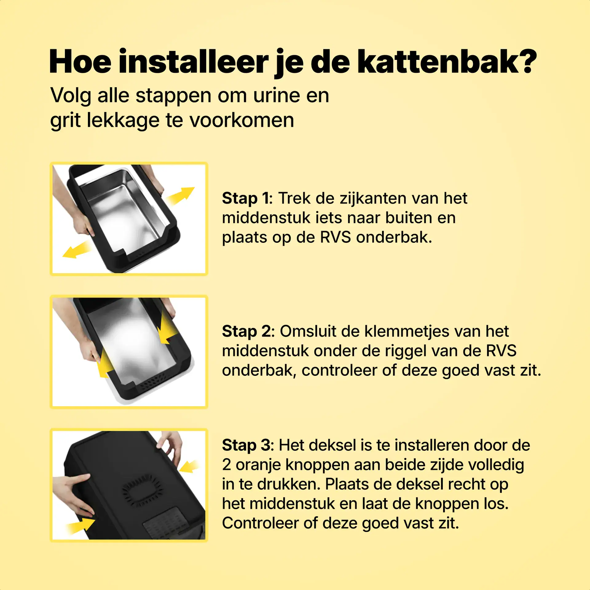 Het voordeel van een RVS-kattenbak is dat deze slijtvast is en een lange levensduur heeft. Er ontstaat geen slijtage door krassende nagels of urine dat in het materiaal trekt zoal wel het geval is bij de kunststof varianten, hierdoor blijft de bak vrij van nare geurtjes. Voor acute boodschap geurtjes is het mogelijk een geurvreter te plaatsen in het daarvoor bestemde compartiment (niet inbegrepen). De kattenbak is verder opgedeeld in 3 onderdelen die naadloos op elkaar aansluiten wat urinelekkage voorkomt.