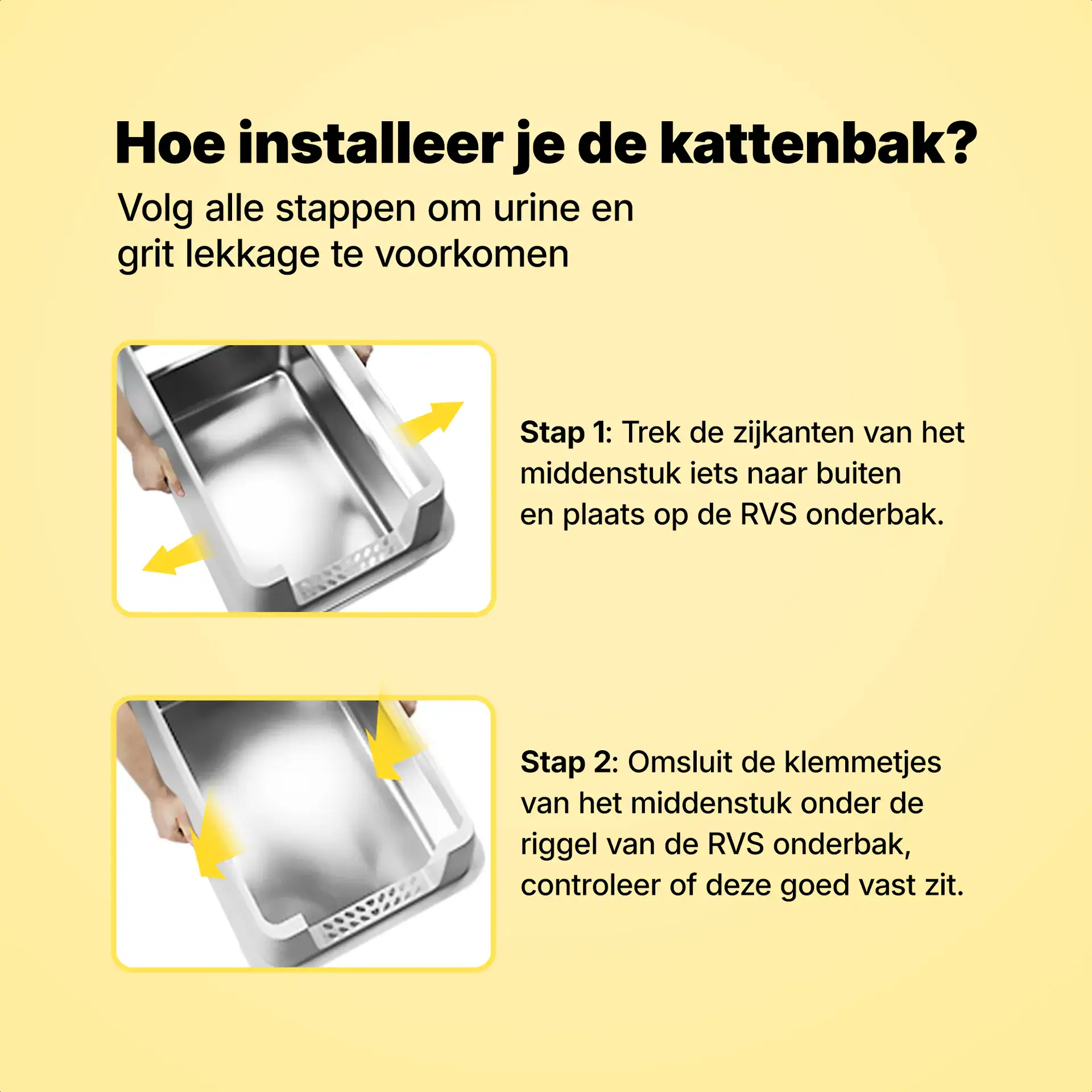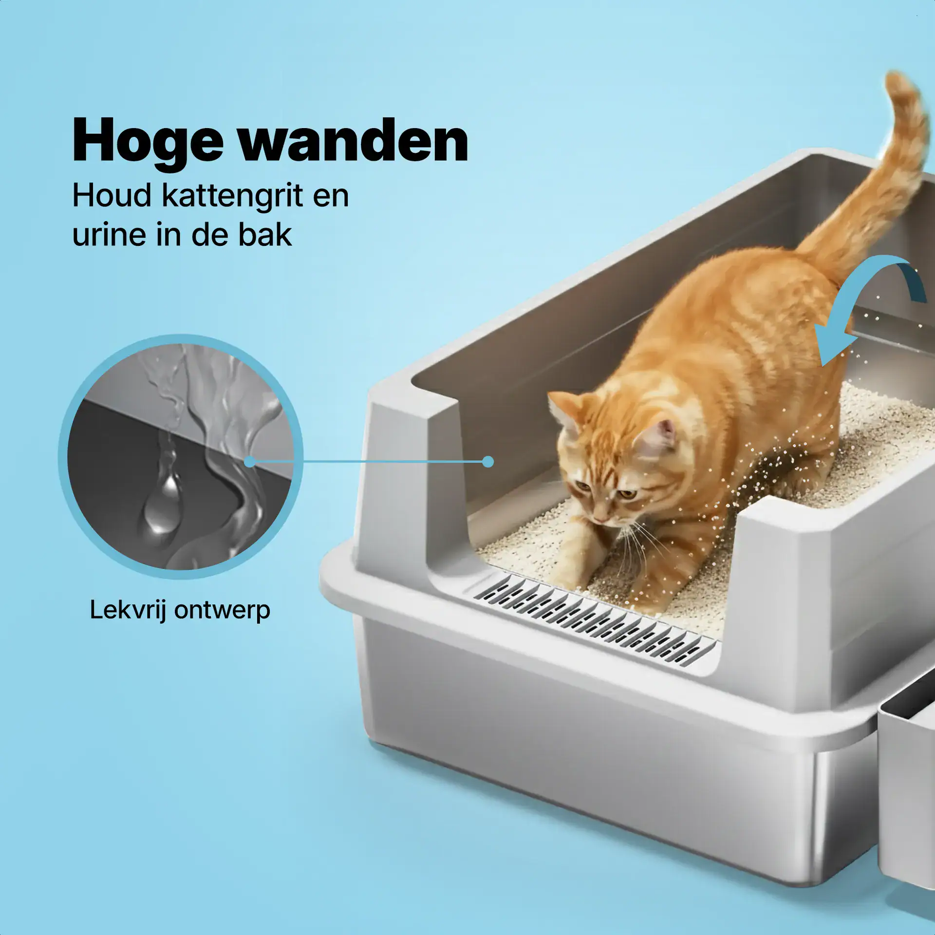 Het voordeel van een RVS-kattenbak is dat deze slijtvast is en een lange levensduur heeft. Er ontstaan geen aangekoekte gritresten zoal wel het geval is bij kunststof varianten, waardoor de bak vrij blijft van nare geurtjes. De kattenbak is verder opgedeeld in 2 onderdelen die naadloos op elkaar aansluiten wat urinelekkage voorkomt. Verder spreekt de grote maat voorzich, ideaal voor meerdere katten, grote kattenrassen óf katten die gewoon van wat extra ruimte houden.