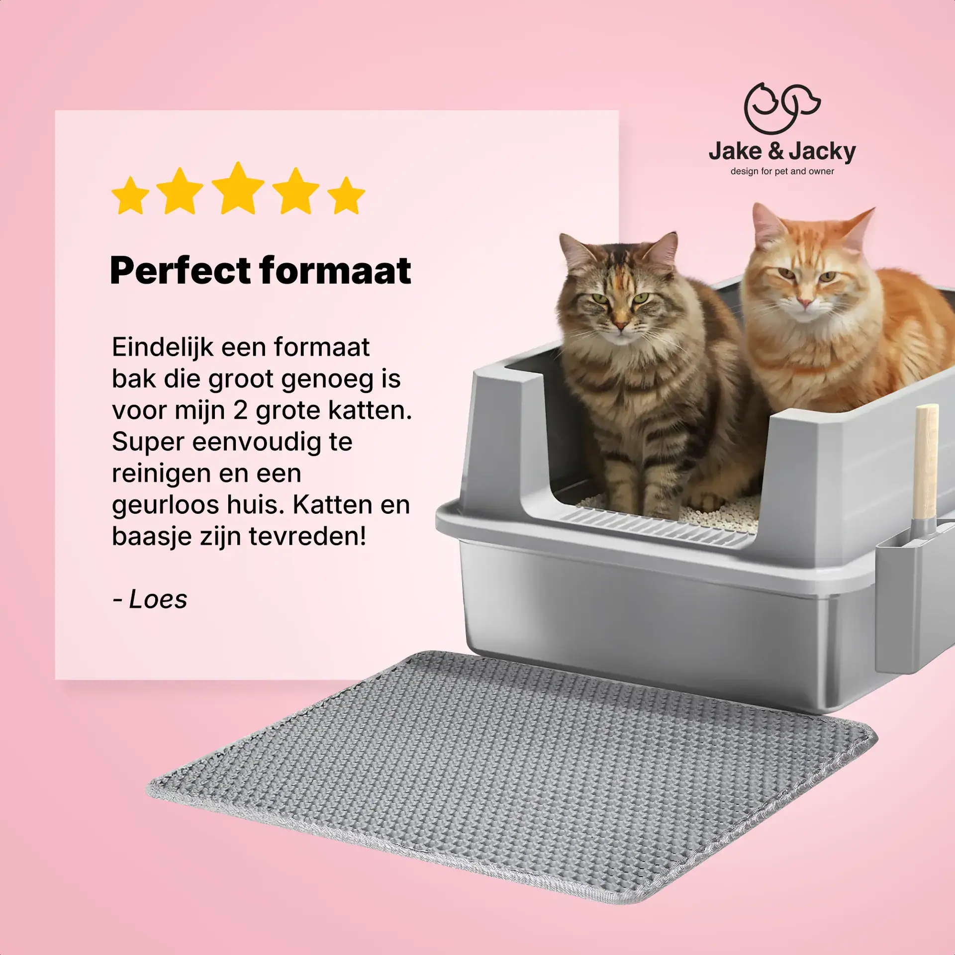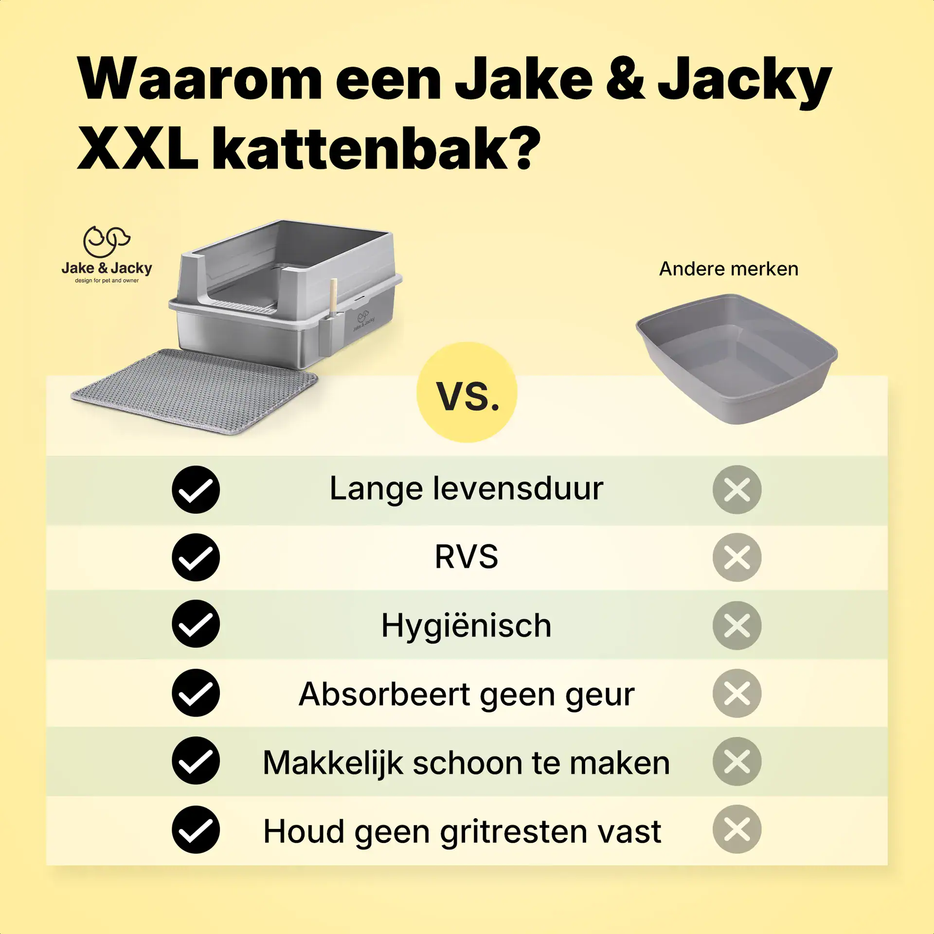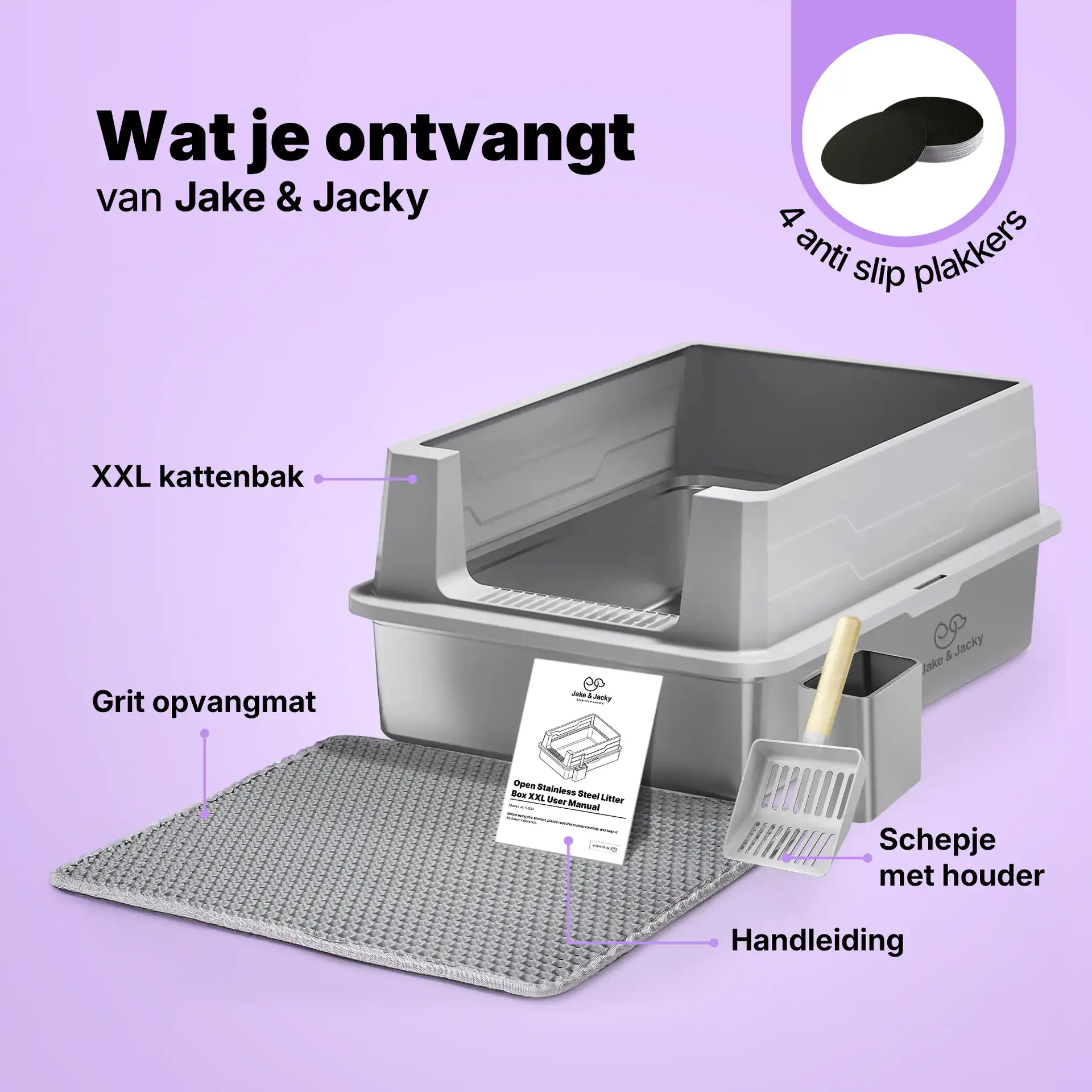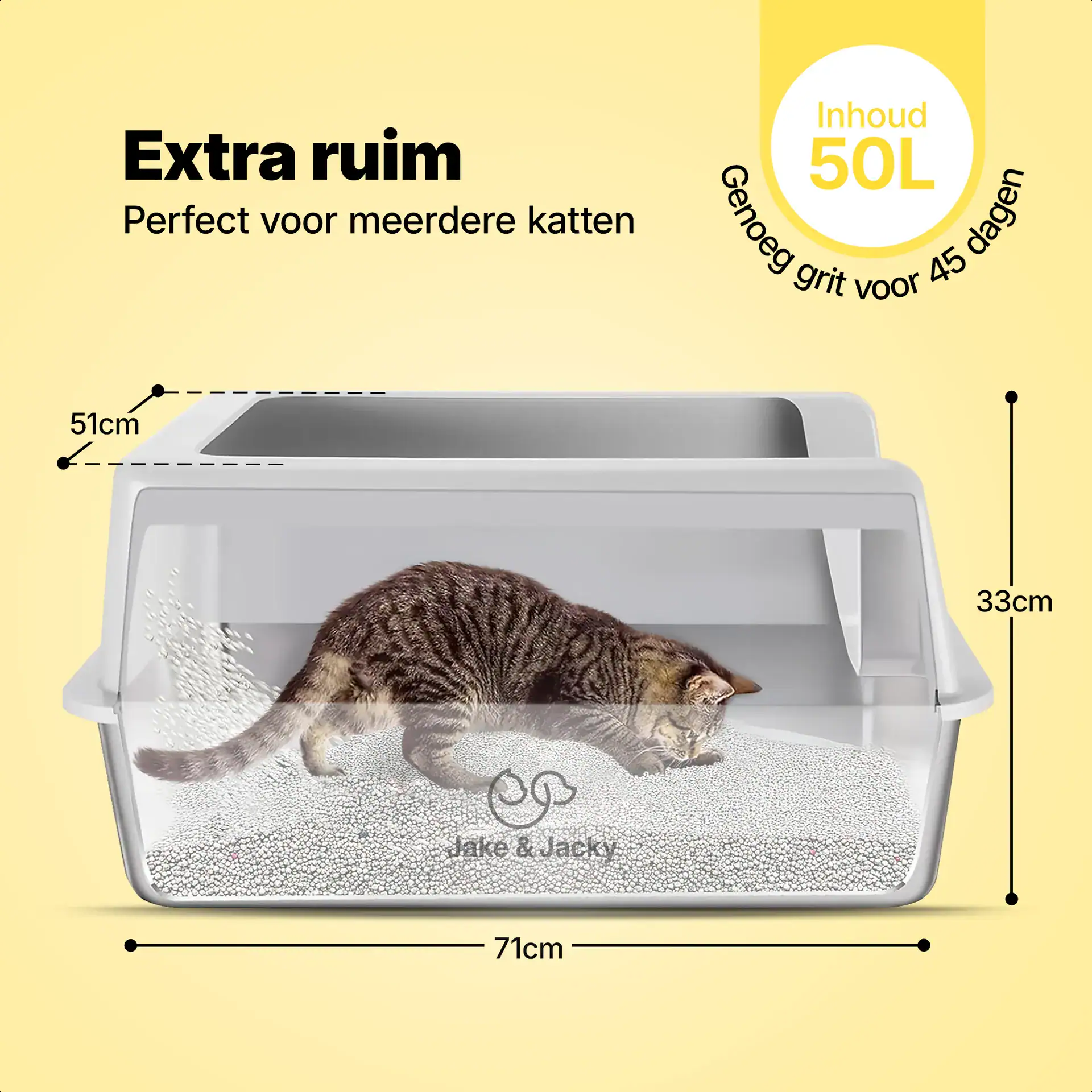 Ben jij op zoek naar een extra grote kattenbak, die geen vieze geurtjes vasthoud, welke makkelijk schoon te maken is, een lange levensduur heeft én een fijne plek biedt voor jouw kat(ten)? Dan is onze innovatieve XXL RVS kattenbak van Jake & Jacky een uitkomst. Onze kattenbak is extra ruim en gemaakt van RVS, welke bestand is tegen vastgekoekte gritresten. Dit voorkomt de typische kattenbak geur zoals bekend bij kunststof varianten. Met de bijleverde gritopvang mat voorkomen we dat het hele huis onder de kattengrit ligt nadat jouw kat klaar is met zijn boodschap.