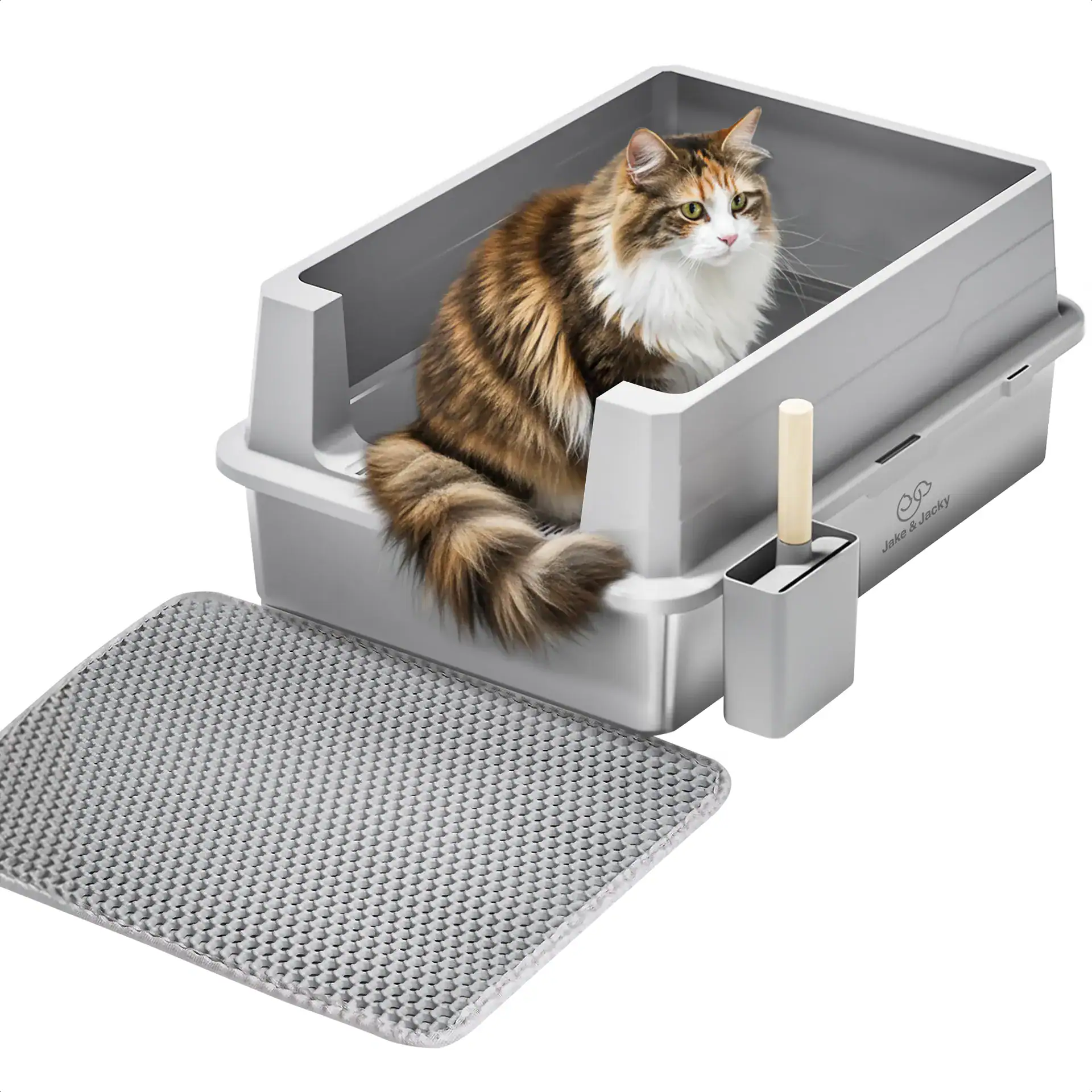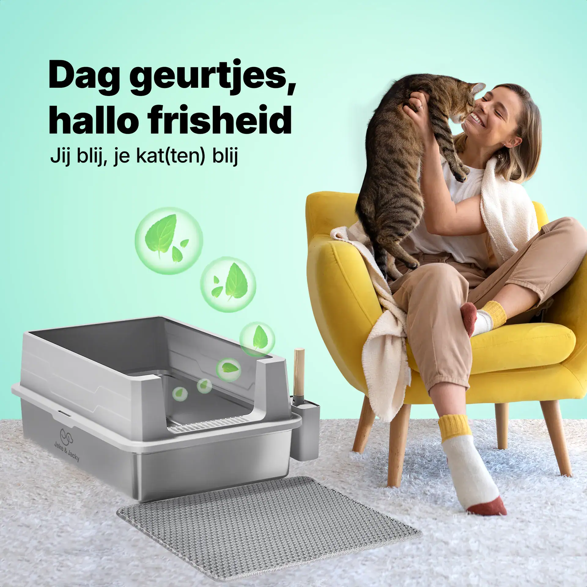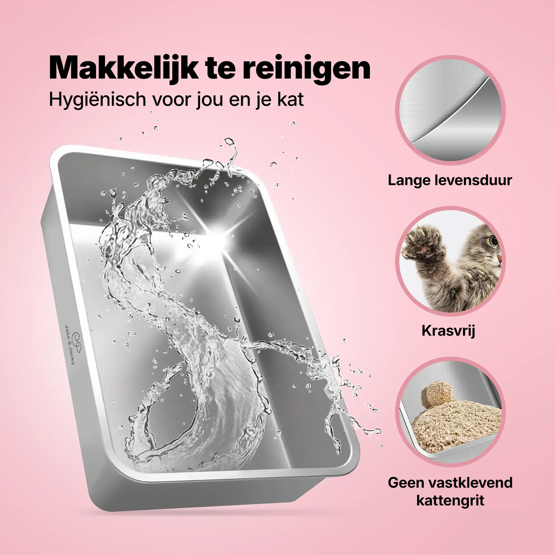 Ben jij op zoek naar een extra grote kattenbak, die geen vieze geurtjes vasthoud, welke makkelijk schoon te maken is, een lange levensduur heeft én een fijne plek biedt voor jouw kat(ten)? Dan is onze innovatieve XXL RVS kattenbak van Jake & Jacky een uitkomst. Onze kattenbak is extra ruim en gemaakt van RVS, welke bestand is tegen vastgekoekte gritresten. Dit voorkomt de typische kattenbak geur zoals bekend bij kunststof varianten. Met de bijleverde gritopvang mat voorkomen we dat het hele huis onder de kattengrit ligt nadat jouw kat klaar is met zijn boodschap.