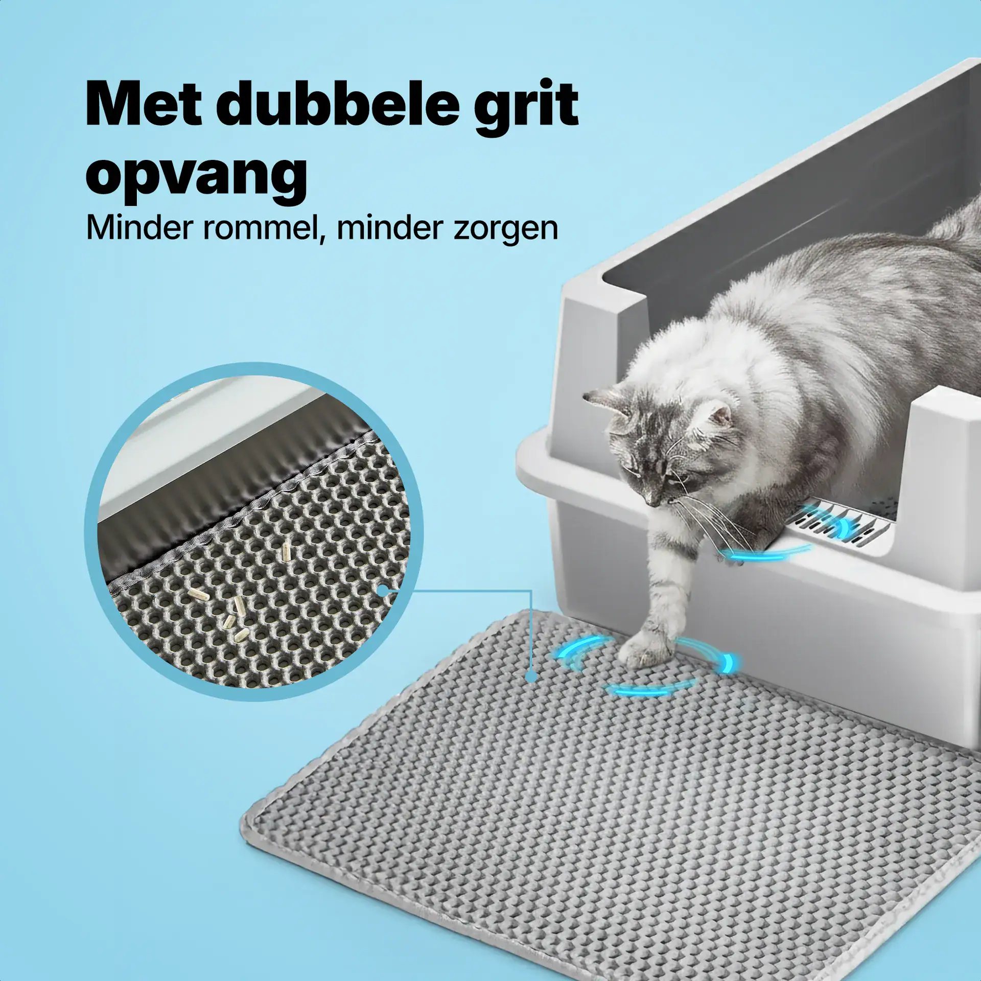 De kattenbak wordt geleverd met een gritopvang mat, wel zo fijn voor jou als baas dat het huis vrij blijft van kattengrit. Ook zit er een schepje bij met houder welke aan de linkerzijde van de bak geplaatst kan worden. Met de antislip plakkers blijft de kattenbak altijd op zijn plaats.