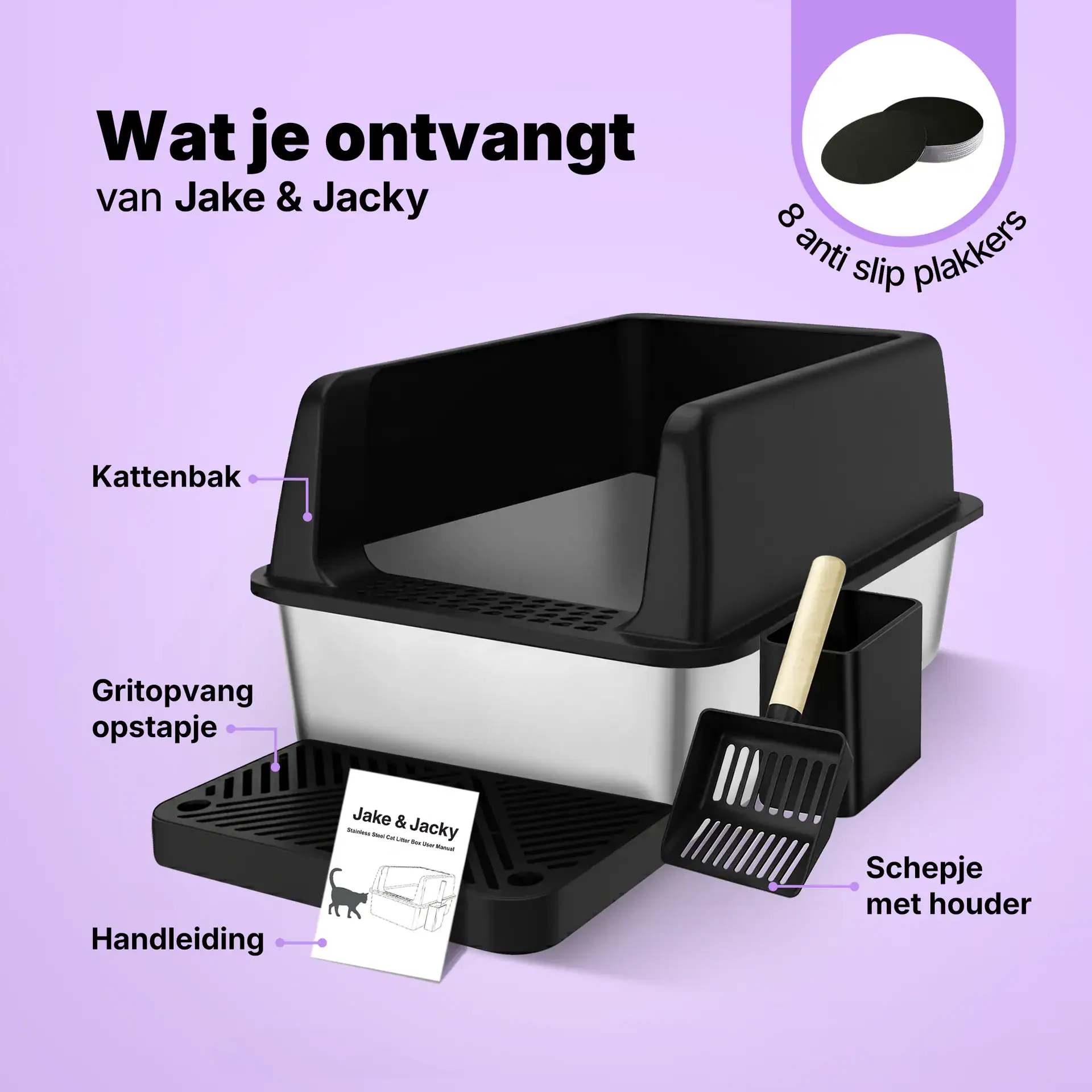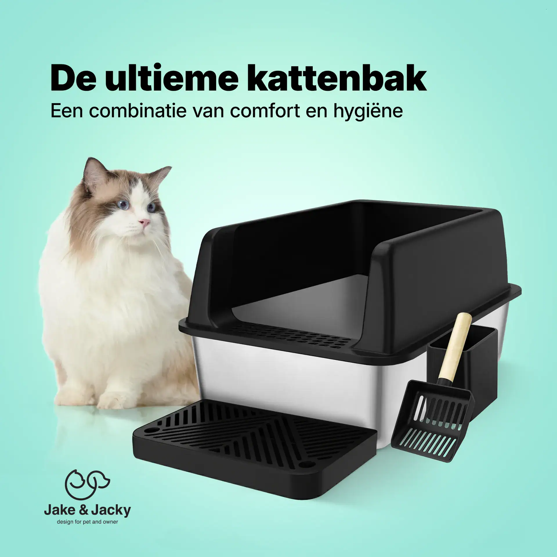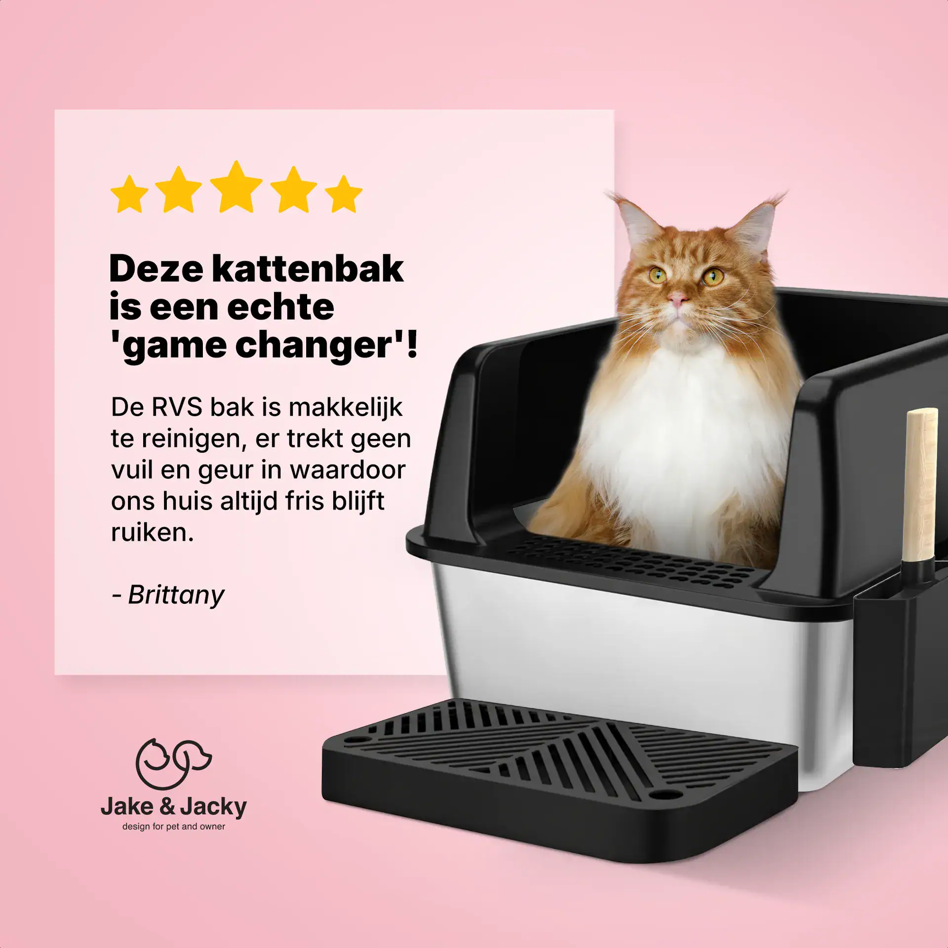 Ben jij vieze kattenbak geurtjes ook zo zat? En ben je op zoek naar een kattenbak die makkelijk schoon te maken is, een lange levensduur heeft en een fijne plek biedt voor jouw kat? Dan is onze innovatieve RVS-kattenbak van Jake & Jacky een uitkomst. Onze kattenbak is gemaakt van RVS, welke bestand is tegen krassen en slijtage. Dit voorkomt de typische kattenbak geur zoals bekend bij kunststof varianten. Het gritopvang opstapje maakt het jouw kat extra makkelijk om naar binnen- en buiten te stappen zonder dat het huis onder het kattengrit ligt.