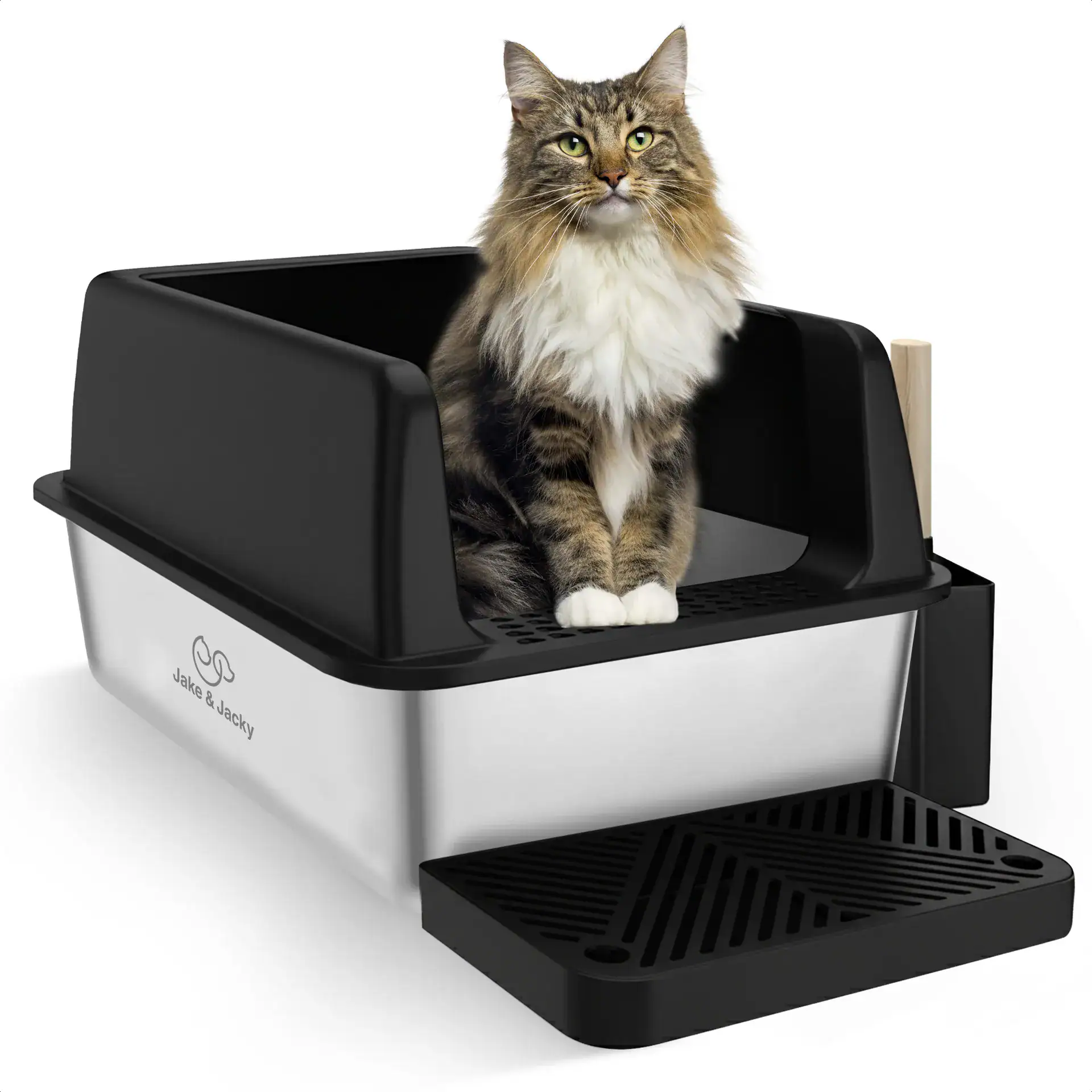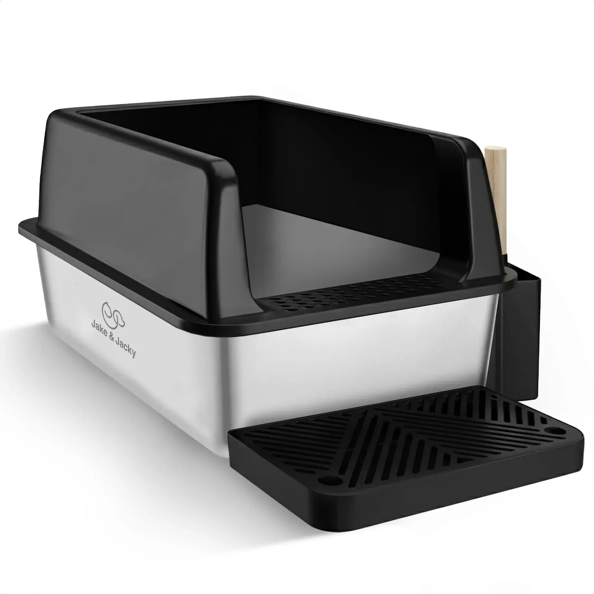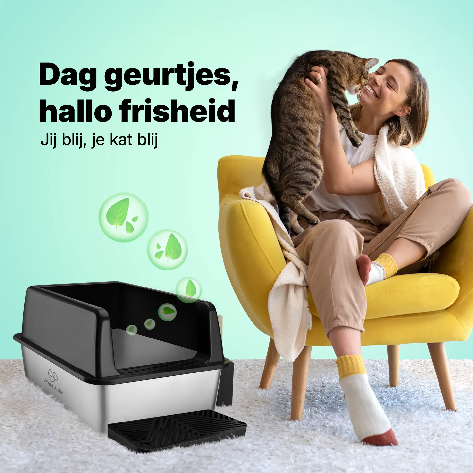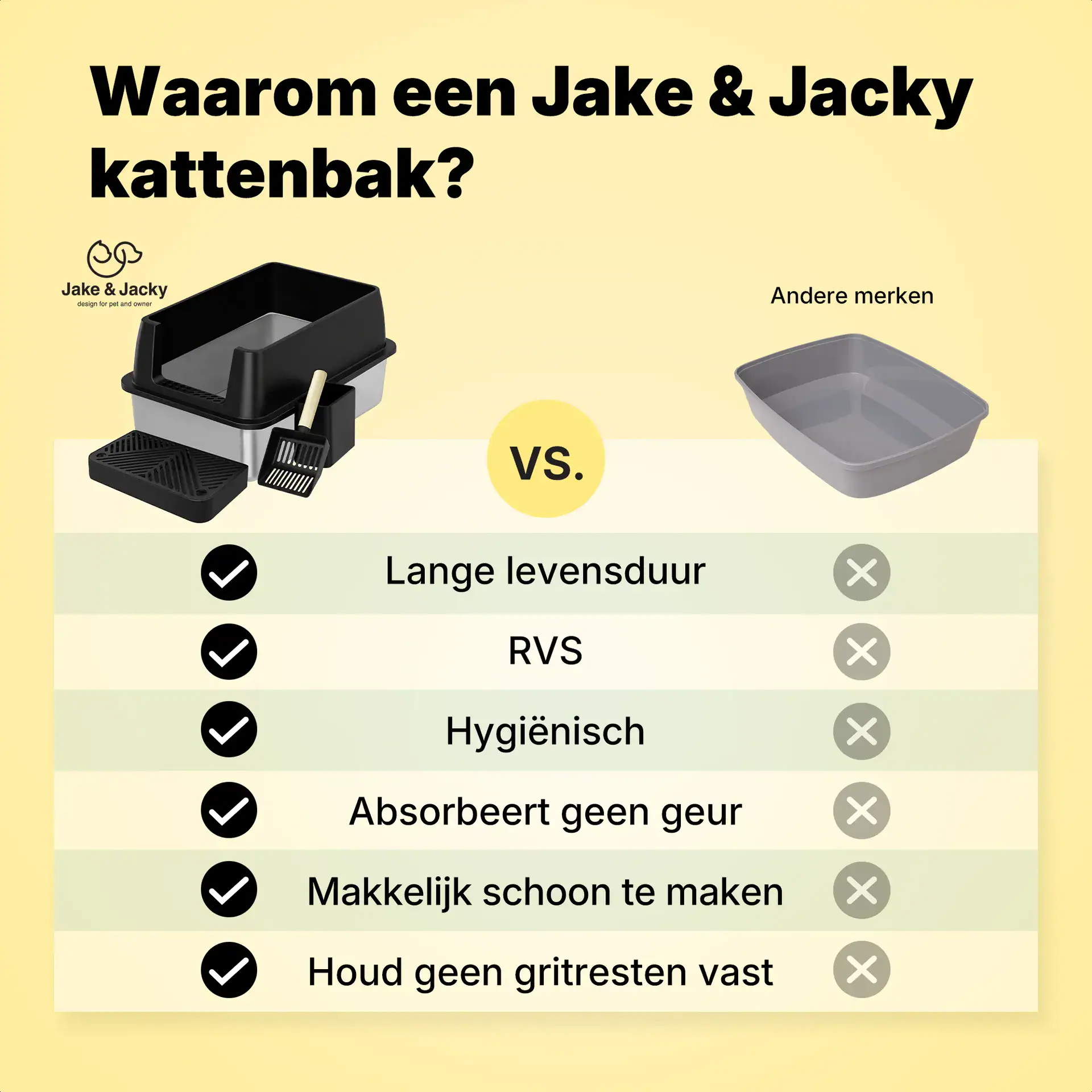 Ben jij vieze kattenbak geurtjes ook zo zat? En ben je op zoek naar een kattenbak die makkelijk schoon te maken is, een lange levensduur heeft en een fijne plek biedt voor jouw kat? Dan is onze innovatieve RVS-kattenbak van Jake & Jacky een uitkomst. Onze kattenbak is gemaakt van RVS, welke bestand is tegen krassen en slijtage. Dit voorkomt de typische kattenbak geur zoals bekend bij kunststof varianten. Het gritopvang opstapje maakt het jouw kat extra makkelijk om naar binnen- en buiten te stappen zonder dat het huis onder het kattengrit ligt.