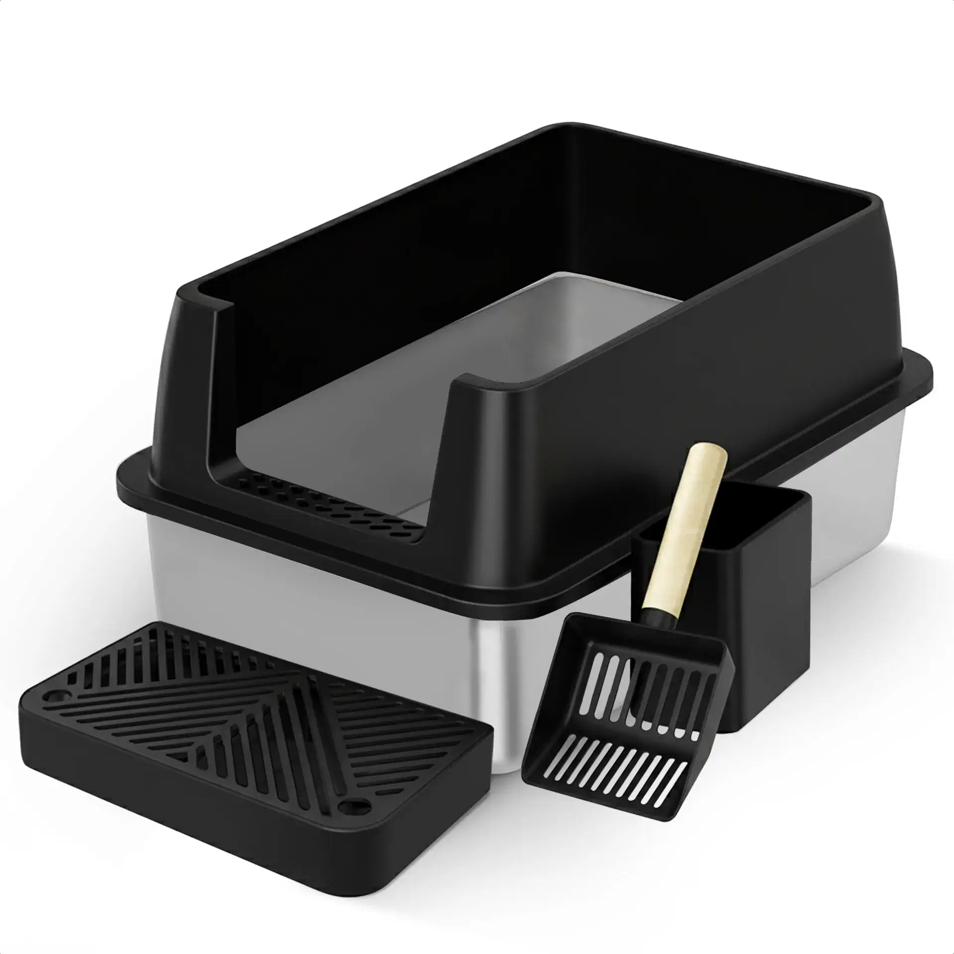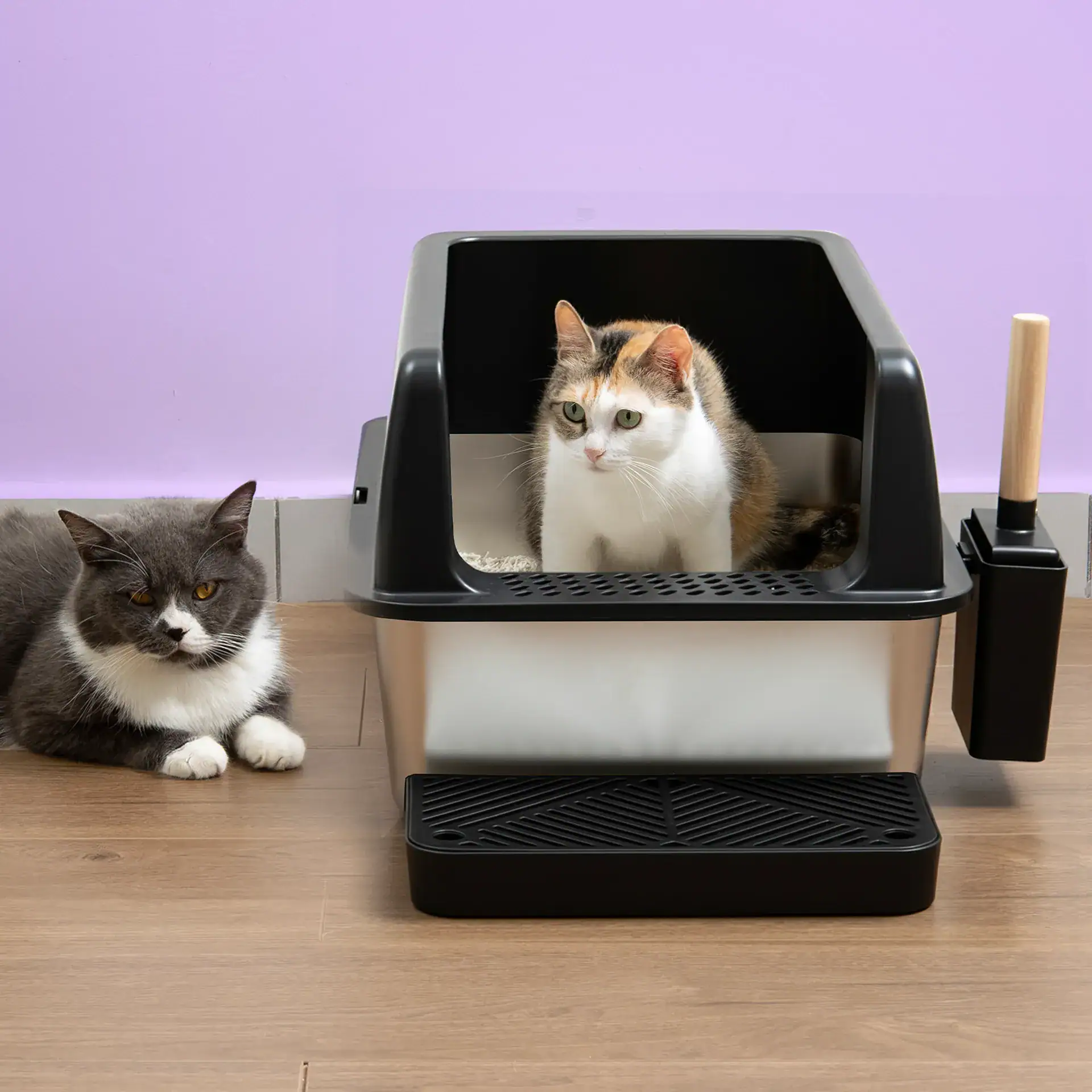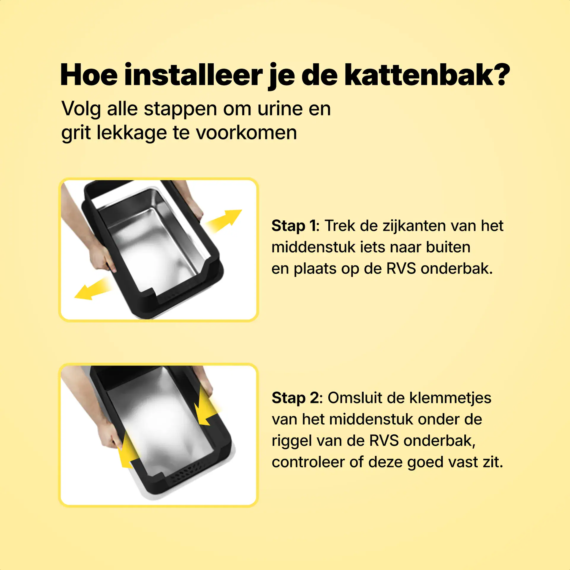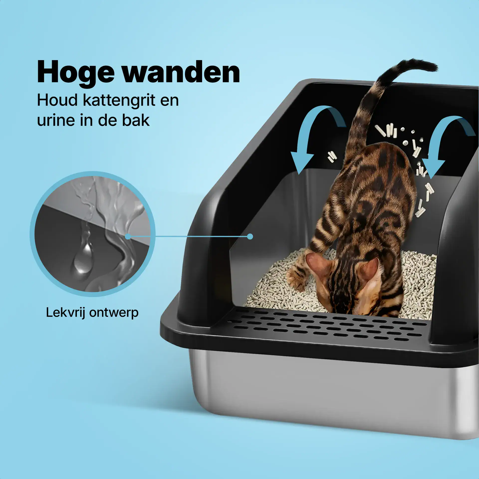 Het voordeel van een RVS-kattenbak is dat deze slijtvast is en een lange levensduur heeft. Er ontstaat geen slijtage door krassende nagels of urine dat in het materiaal trekt zoal wel het geval is bij de kunststof varianten, hierdoor blijft de bak vrij van nare geurtjes. De kattenbak is verder opgedeeld in 2 onderdelen die naadloos op elkaar aansluiten wat urinelekkage voorkomt.