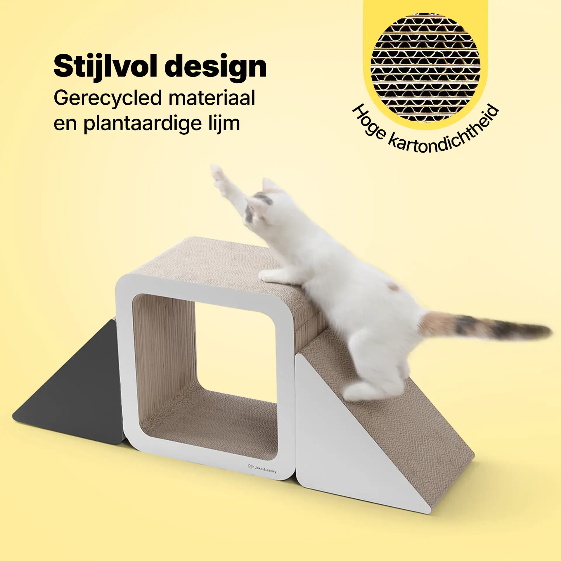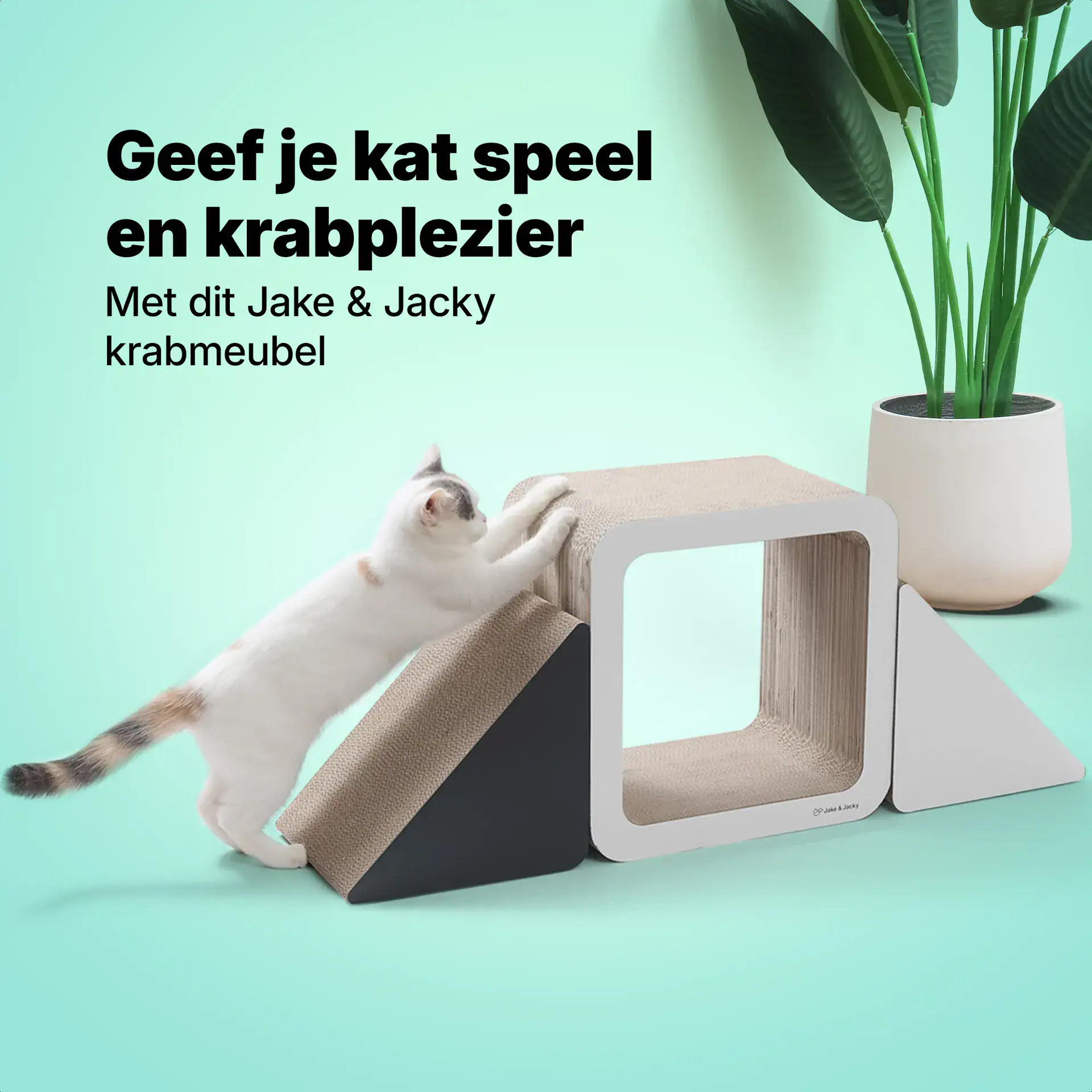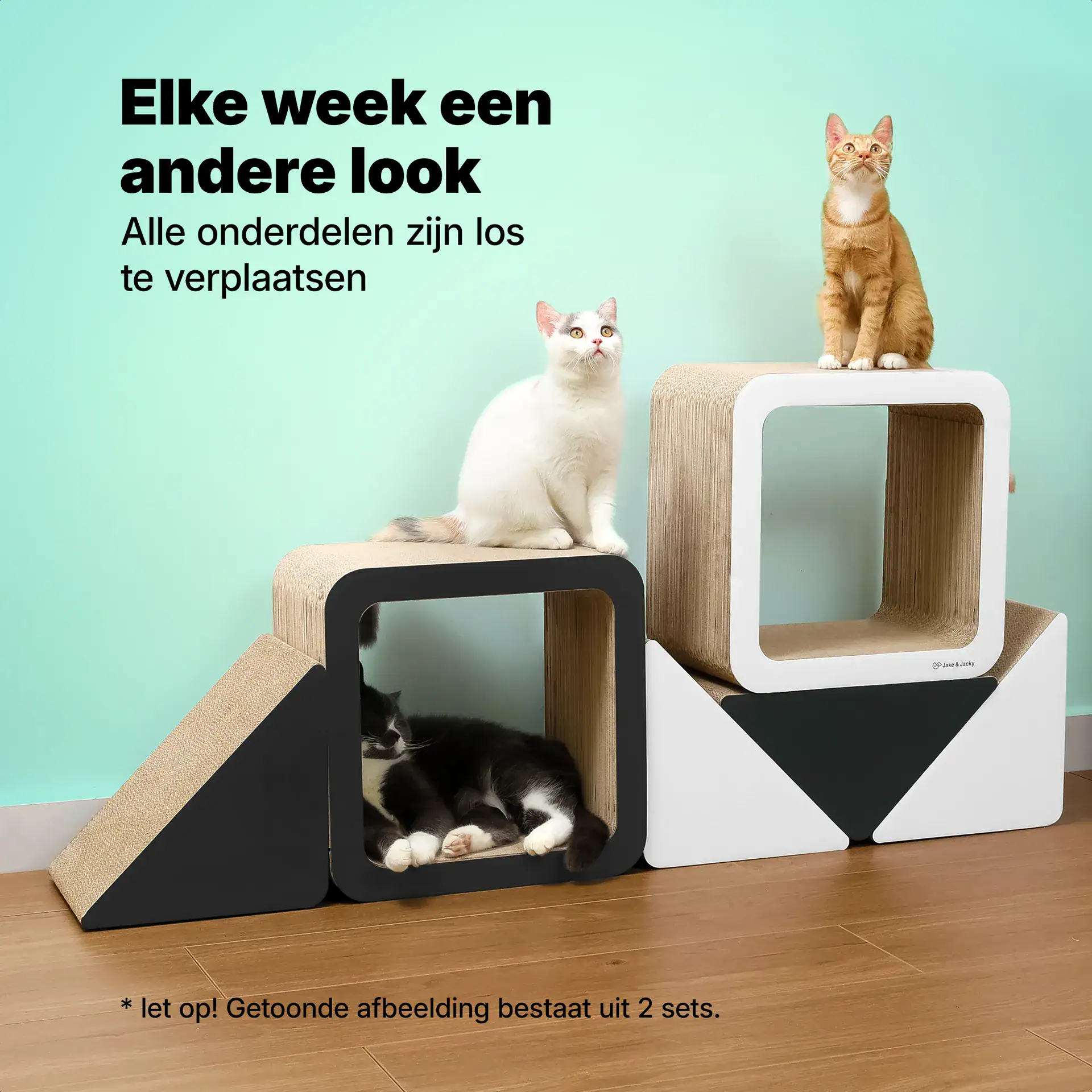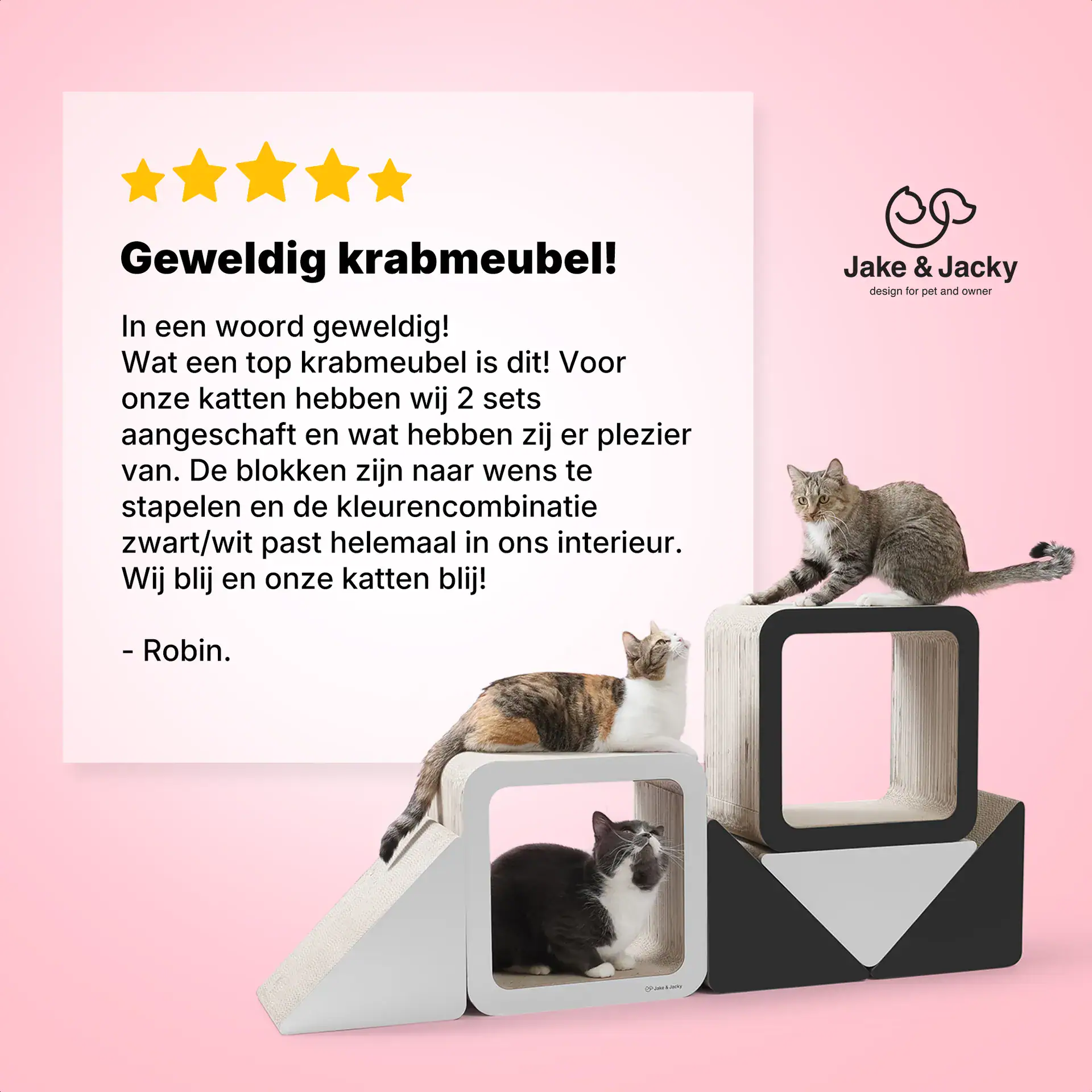 Naast dat dit krabmeubel graag gebruikt zal worden om aan te krabben, is het ook heerlijk als kattenmand en een fijne speelplek voor jou kat(ten). De 3 losse blokken zijn in elke gewenste opstelling neer te zetten voor speelvariatie, extra leuk om 2 sets neer te zetten voor nóg meer speel mogelijkheden of bij meerdere katten. Kies ook je gewenste kleur, wit of zwart of maak een mooie combinatie.
