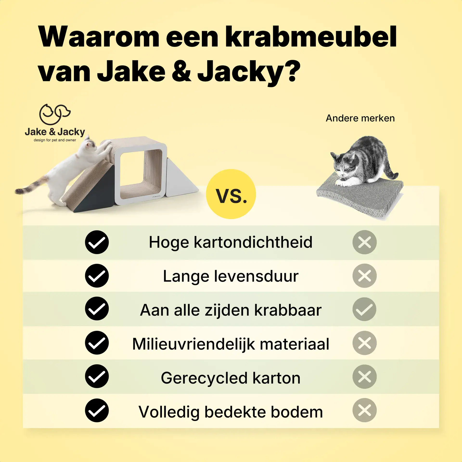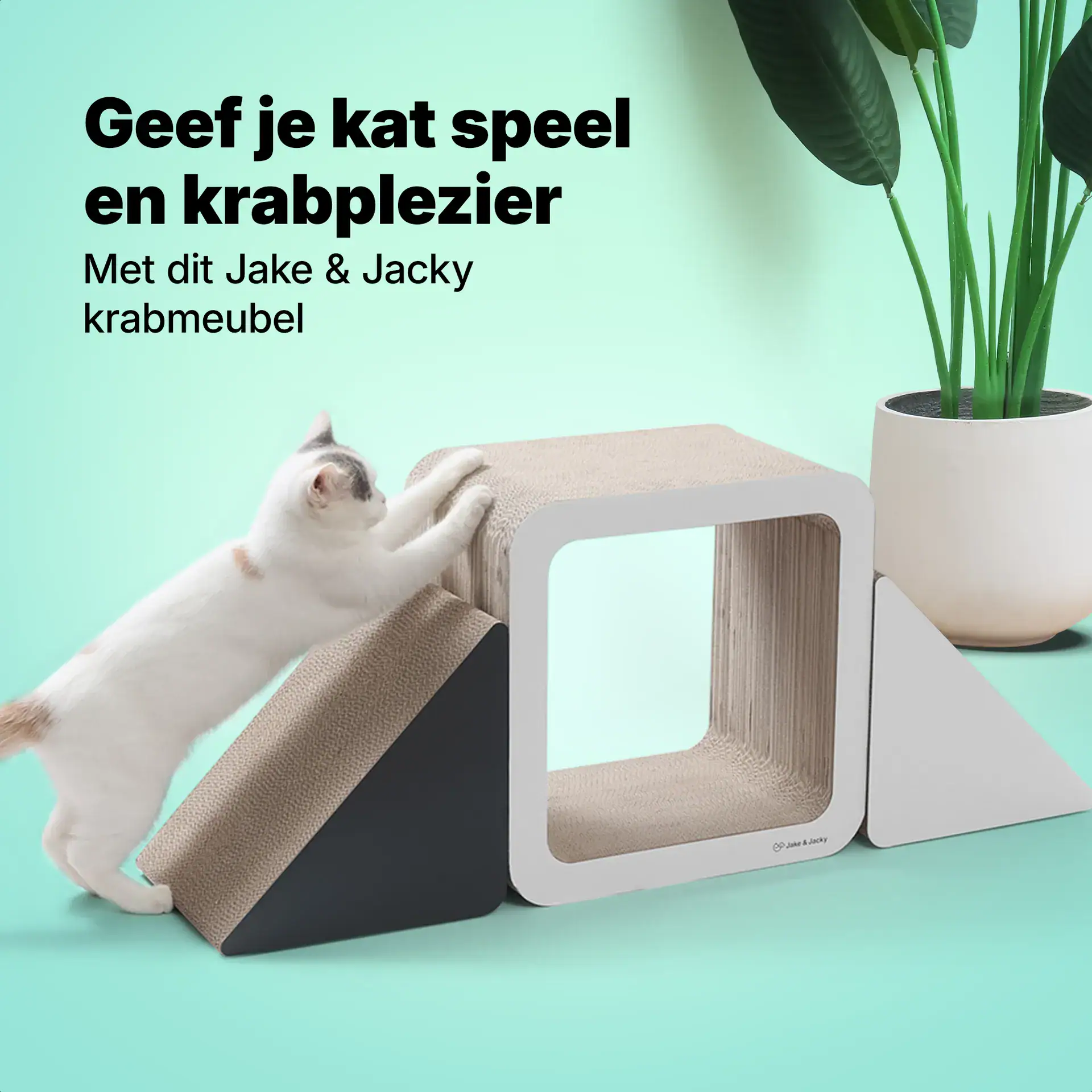 Geef jouw kat ook eindeloos krab, speel en slaapplezier met deze 3 in 1 krabkarton blokken van Jake & Jacky. Katten zijn dol op de textuur van karton om hun nagels aan te scherpen maar ook om op te slapen. Karton heeft als eigenschap dat het isoleert en dus lekker warm en knus aanvoelt. Niet voor niets kruipen katten graag in een kartonnen doos! Maak deze krabkarton blokken nog interessanter voor jouw kat met het meegeleverde kattenkruid voor uren speelplezier.