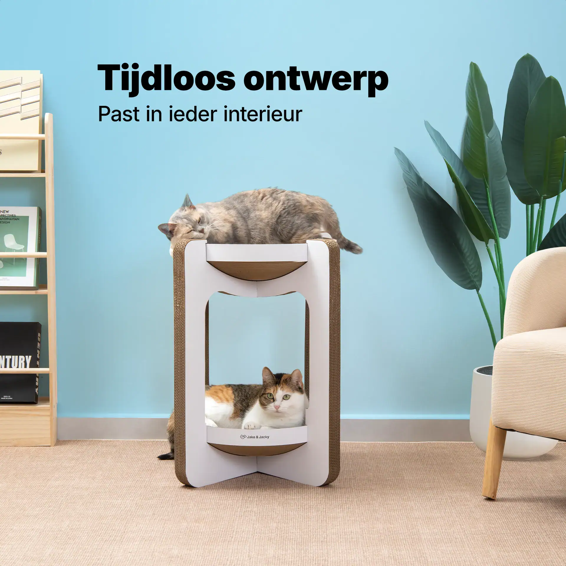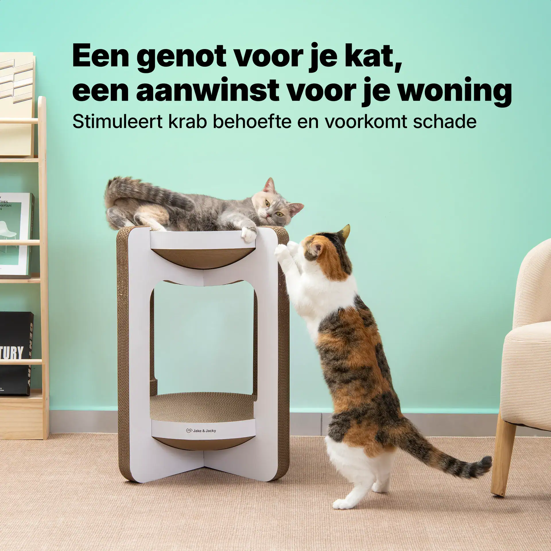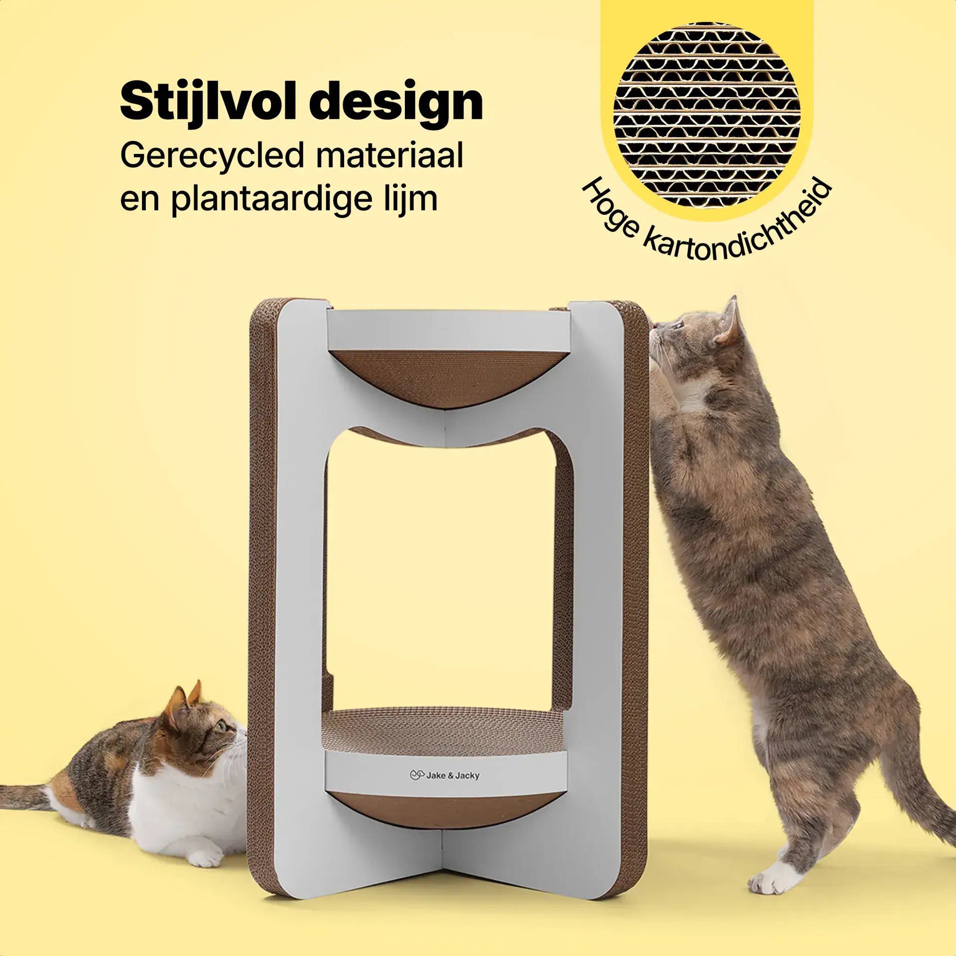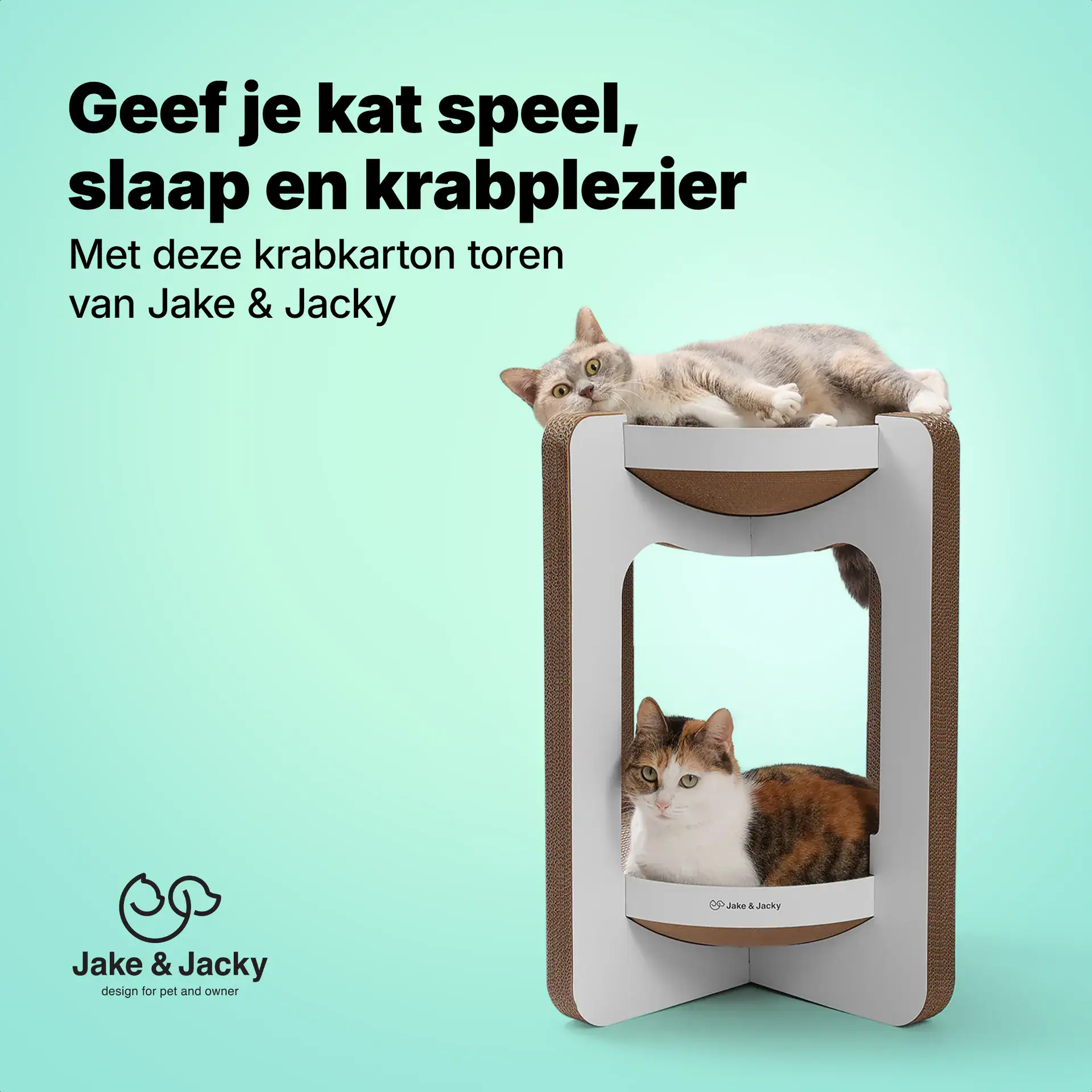 Geef jouw kat ook eindeloos krab, speel en slaapplezier met deze stijlvolle krabkarton toren van Jake & Jacky. Katten zijn dol op de textuur van karton om hun nagels aan te scherpen maar ook om op te slapen. Karton heeft als eigenschap dat het isoleert en dus lekker warm en knus aanvoelt. Niet voor niets kruipen katten graag in een kartonnen doos! Maak dit krabkarton nog interessanter voor jouw kat met het meegeleverde kattenkruid voor uren speelplezier.