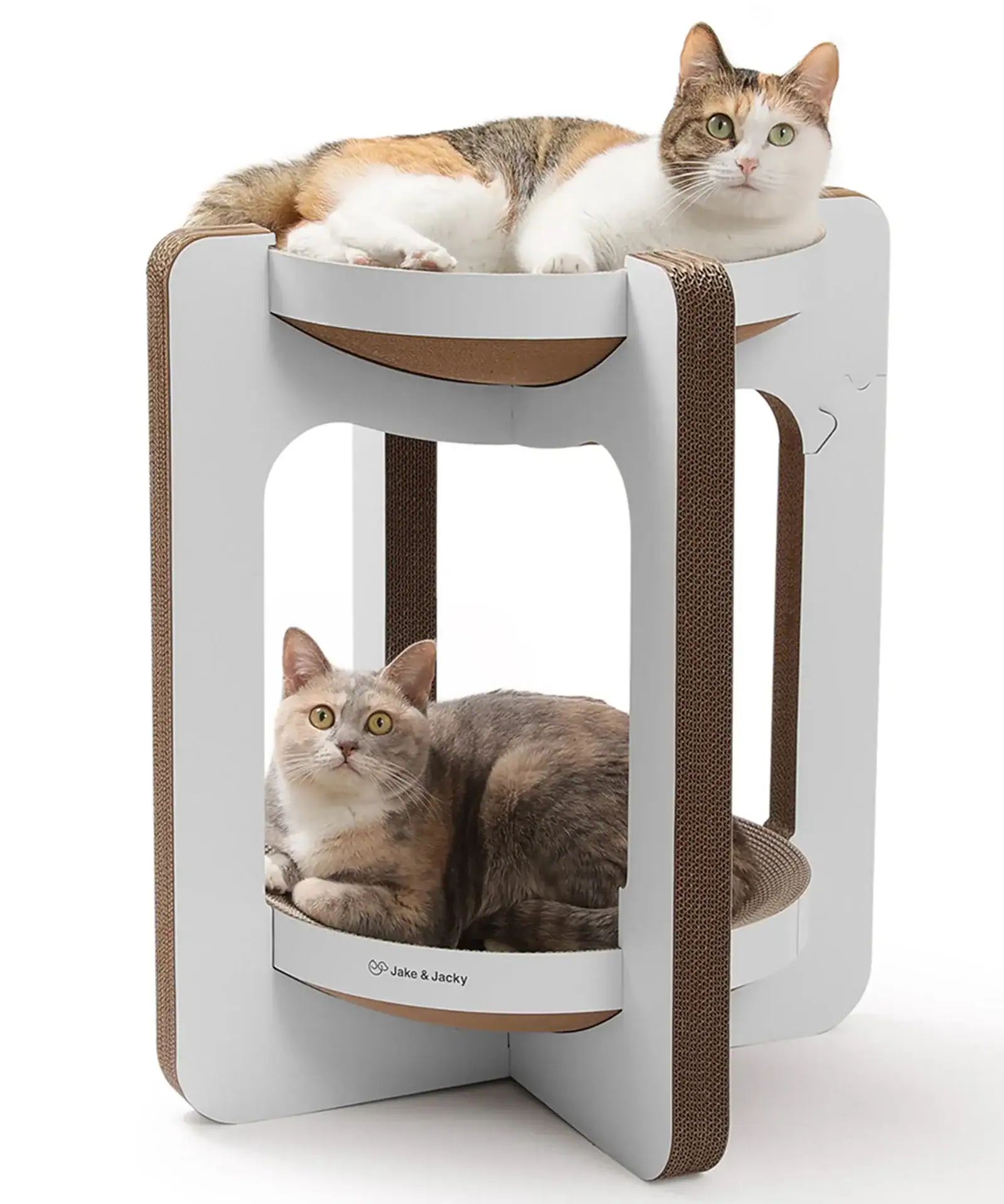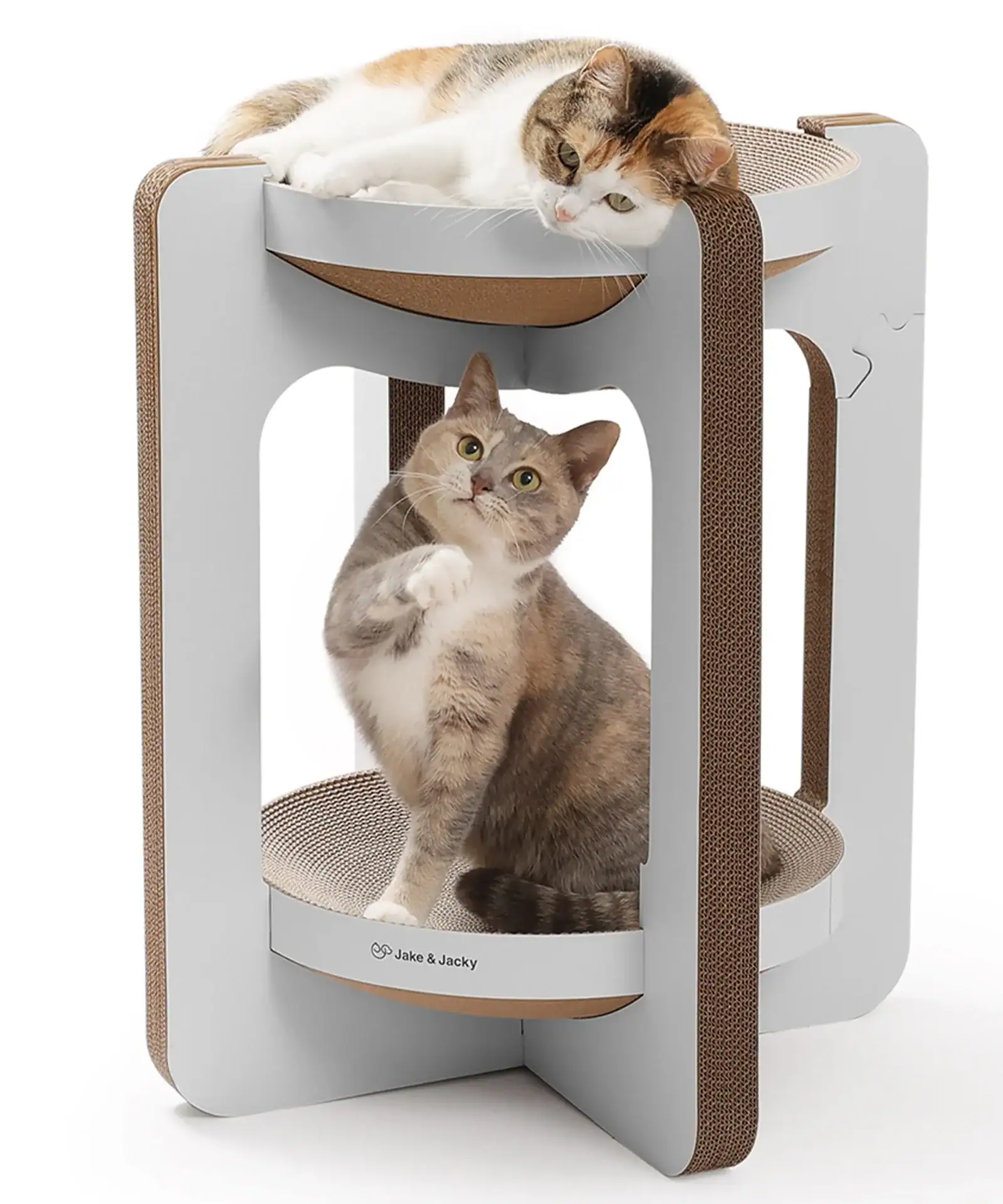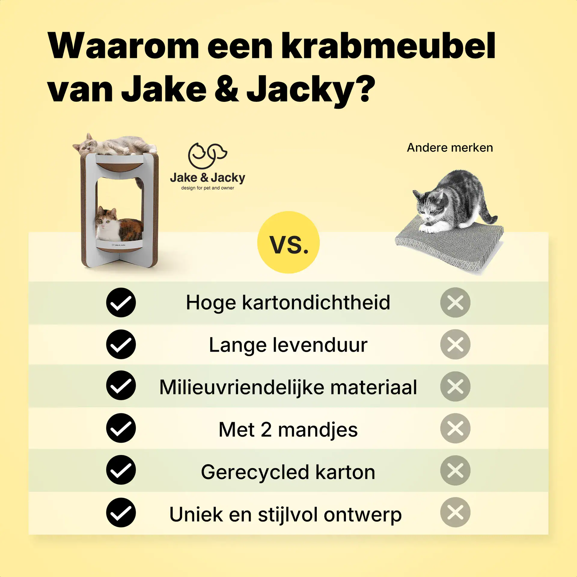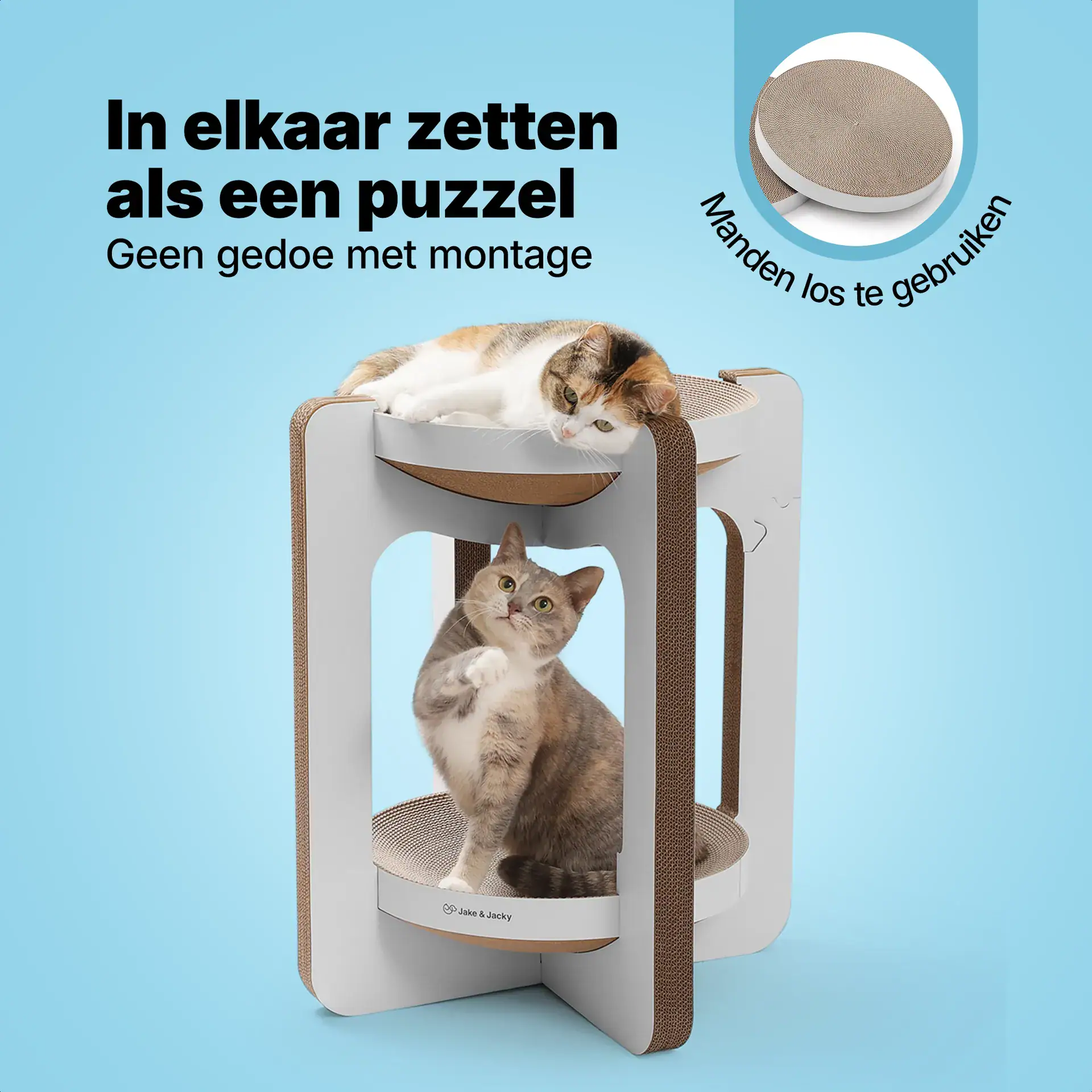Geef jouw kat ook eindeloos krab, speel en slaapplezier met deze stijlvolle krabkarton toren van Jake & Jacky. Katten zijn dol op de textuur van karton om hun nagels aan te scherpen maar ook om op te slapen. Karton heeft als eigenschap dat het isoleert en dus lekker warm en knus aanvoelt. Niet voor niets kruipen katten graag in een kartonnen doos! Maak dit krabkarton nog interessanter voor jouw kat met het meegeleverde kattenkruid voor uren speelplezier.