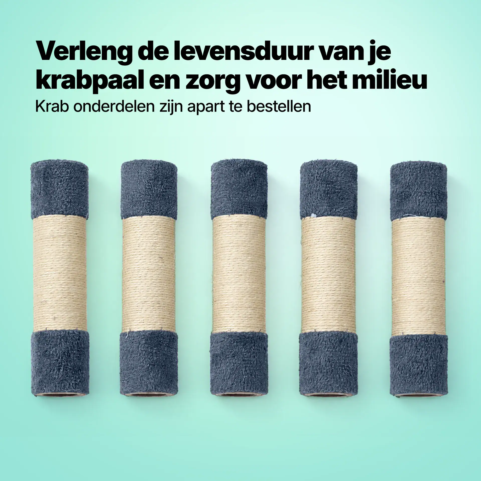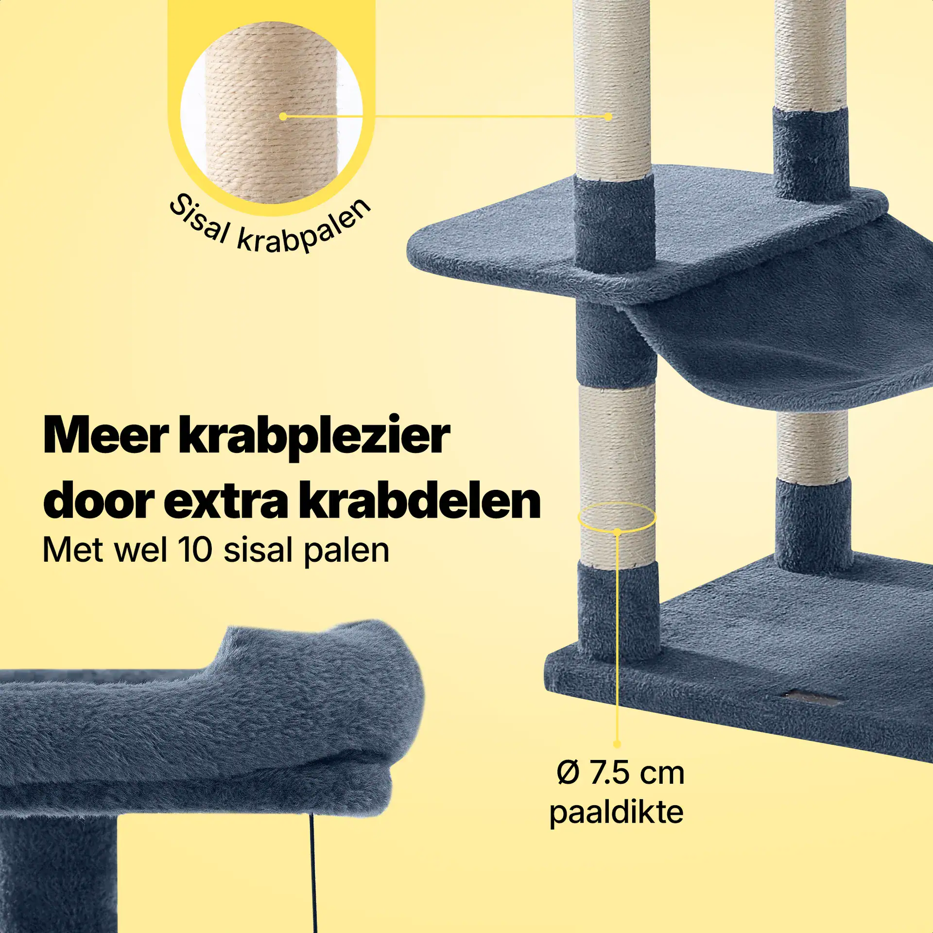 Onze krabpaal geeft jouw kat op elke niveau ruimte om te krabben. In tegenstelling tot andere aanbieders heeft onze krabpaal maar liefst 10 stevige sisal krabpalen van Ø 7,5 cm welke ook nog vervangbaar zijn, wel zo goed voor het milieu en voor jouw portemonnee.