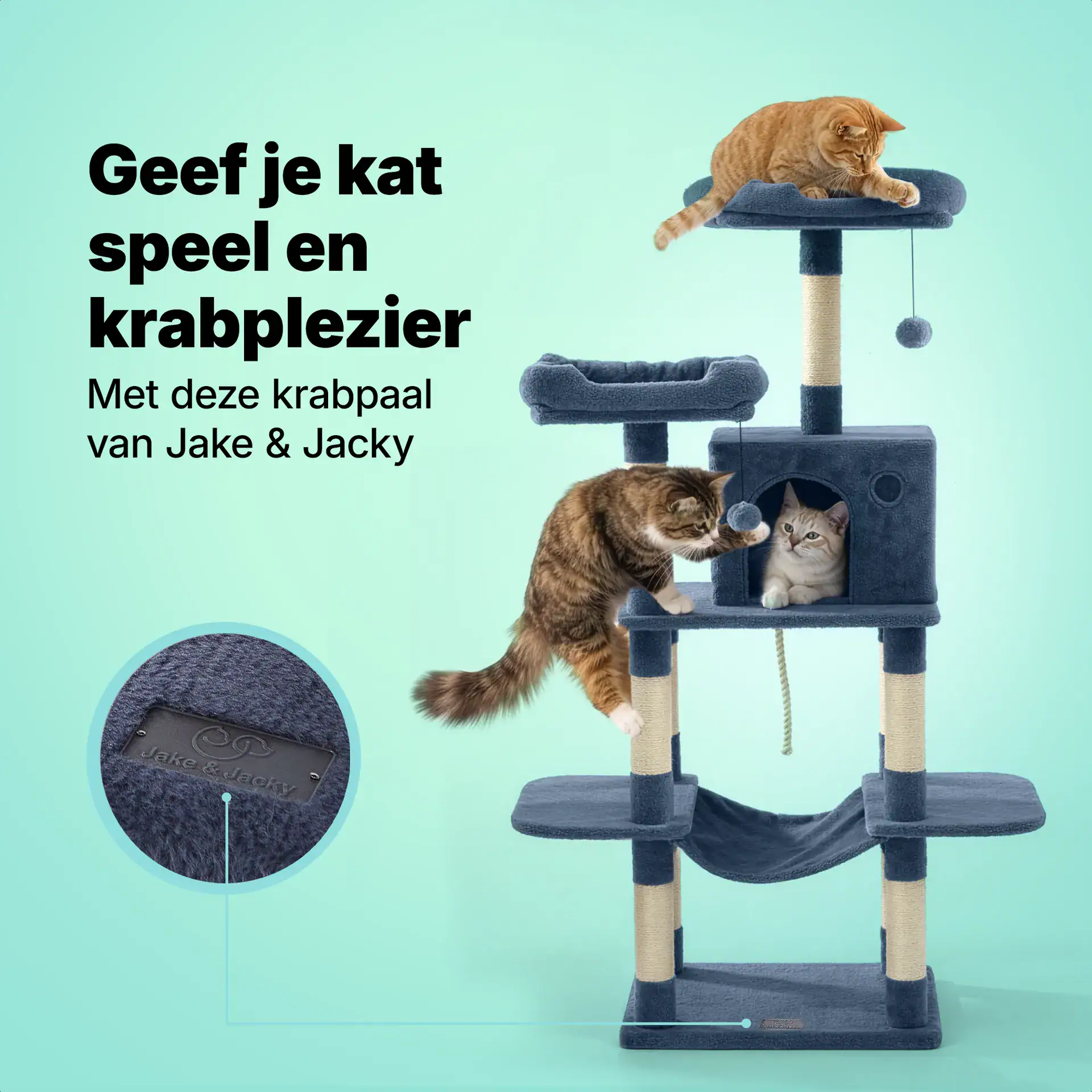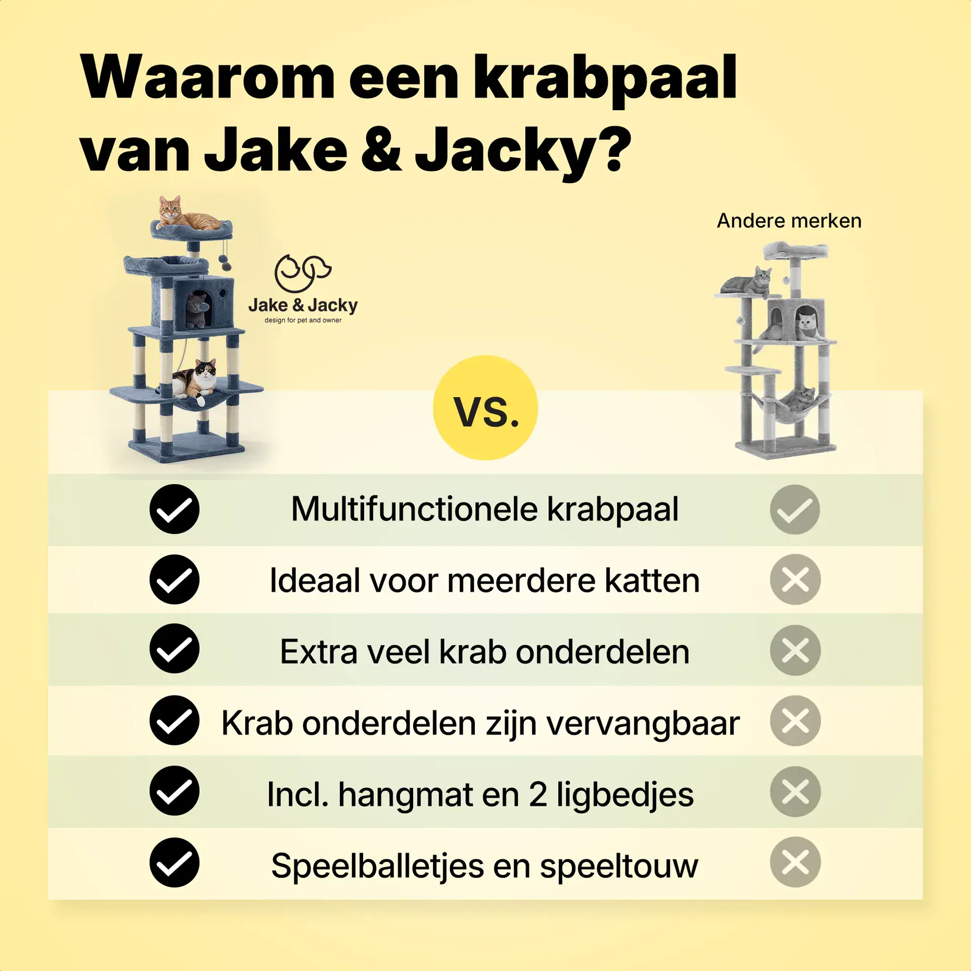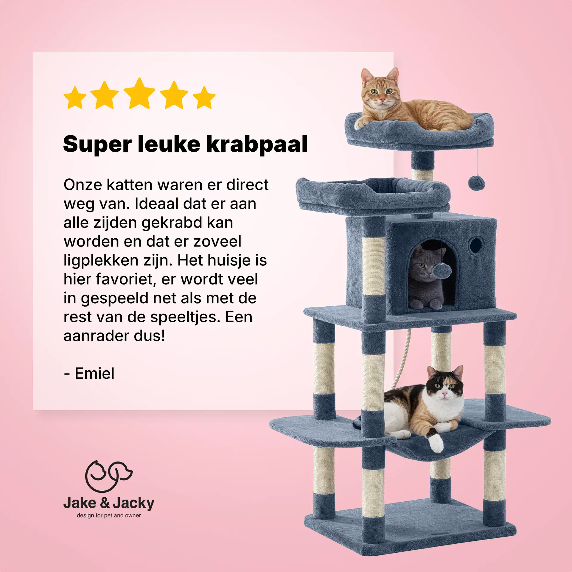 Geef jou kat(ten) ook een krabpaal waar hij lekker in kan klimmen, aan kan krabben en in kan slapen. Deze krabpaal van Jake & Jacky biedt het allemaal. Dankzij de slimme indeling, de stevige afwerking en maar liefst 10 sisal krabpalen, die ook nog te vervangen zijn, is dit hét ideale krabmeubel voor jouw harige vriend(en).