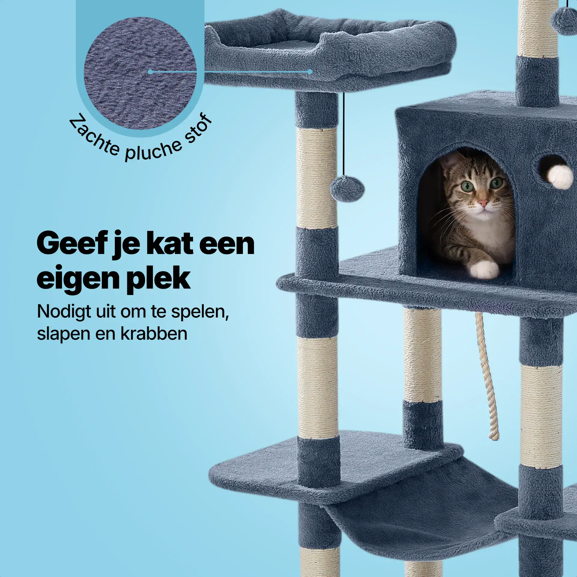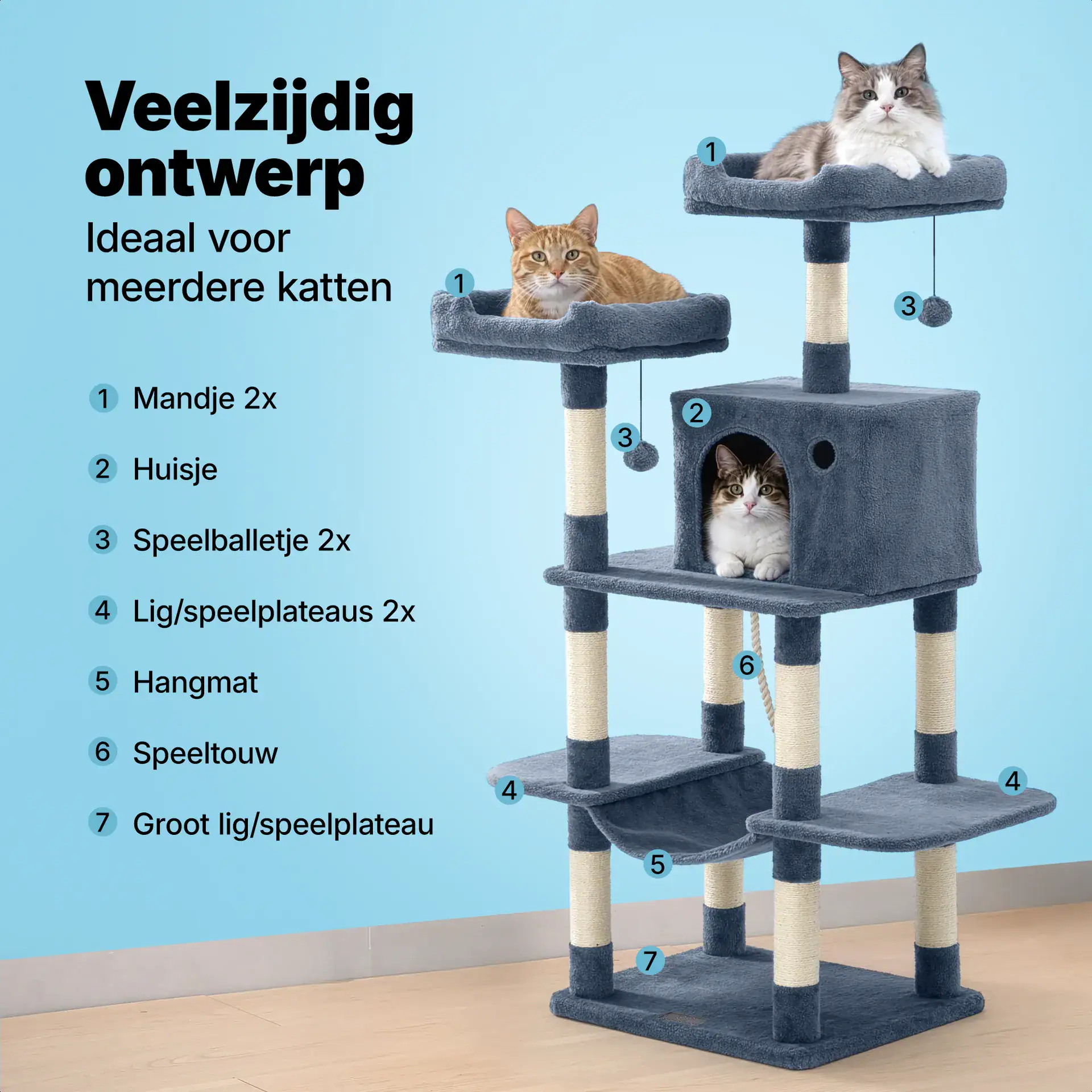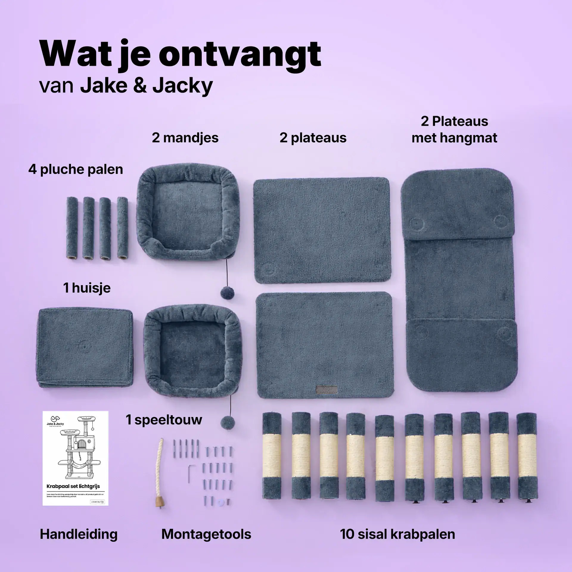 2 grote plateaus, 2 plateaus met hangmat, 2 mandjes met balletje, 4 pluche palen, 10 sisal krabpalen, 1 huisje, 1 speeltouw, Set montagetools, Handleiding
