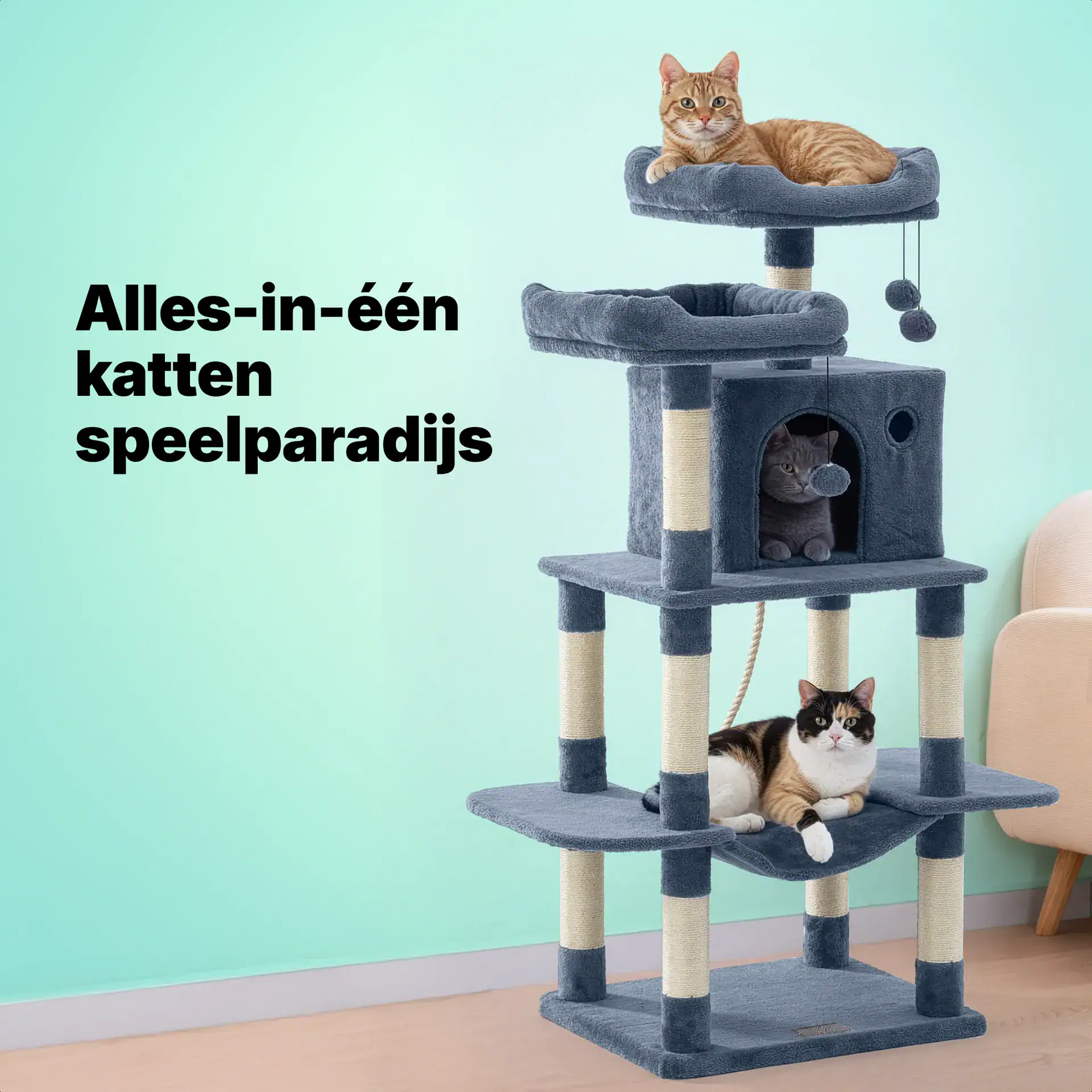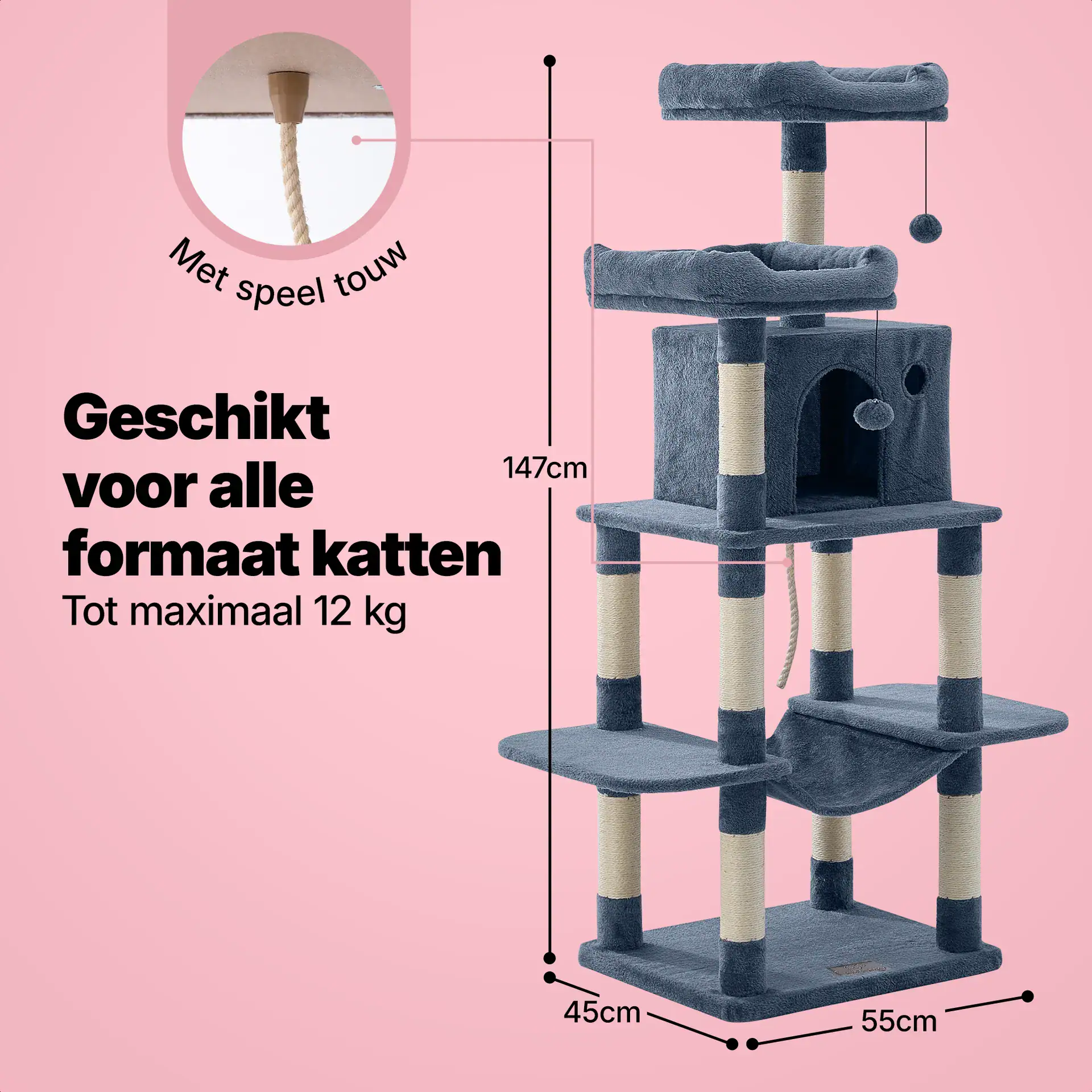 Met deze alles-in-een krabpaal wordt jouw kat in al zijn behoeftes voorzien. Hij kan hierin spelen, krabben en slapen en met een hoogte van 147 cm kan jouw kat ook zeker zijn klimbehoefte kwijt. Met een gewicht van 15 kg is deze krabpaal zeer stabiel wat hem toegankelijk maakt voor meerdere katten (max gewicht van 12 kg). Dankzij de goed doordachte indeling met meerdere bedjes, speelhuisje, hangmat en diverse speeltjes hebben we deze krabpaal extra uitdagend gemaakt.