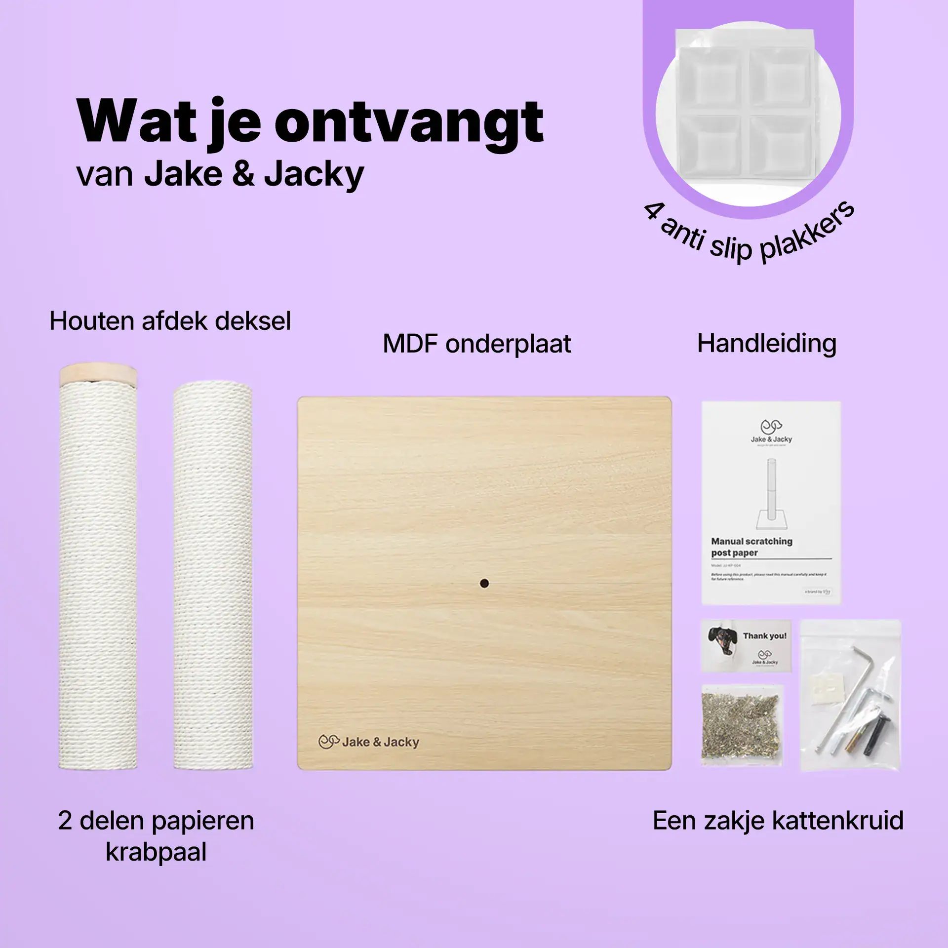 2 delen papieren krabpaal , 1 MDF onderplaat, 1 houten afdek deksel, 4 antislip plakkers, handleiding