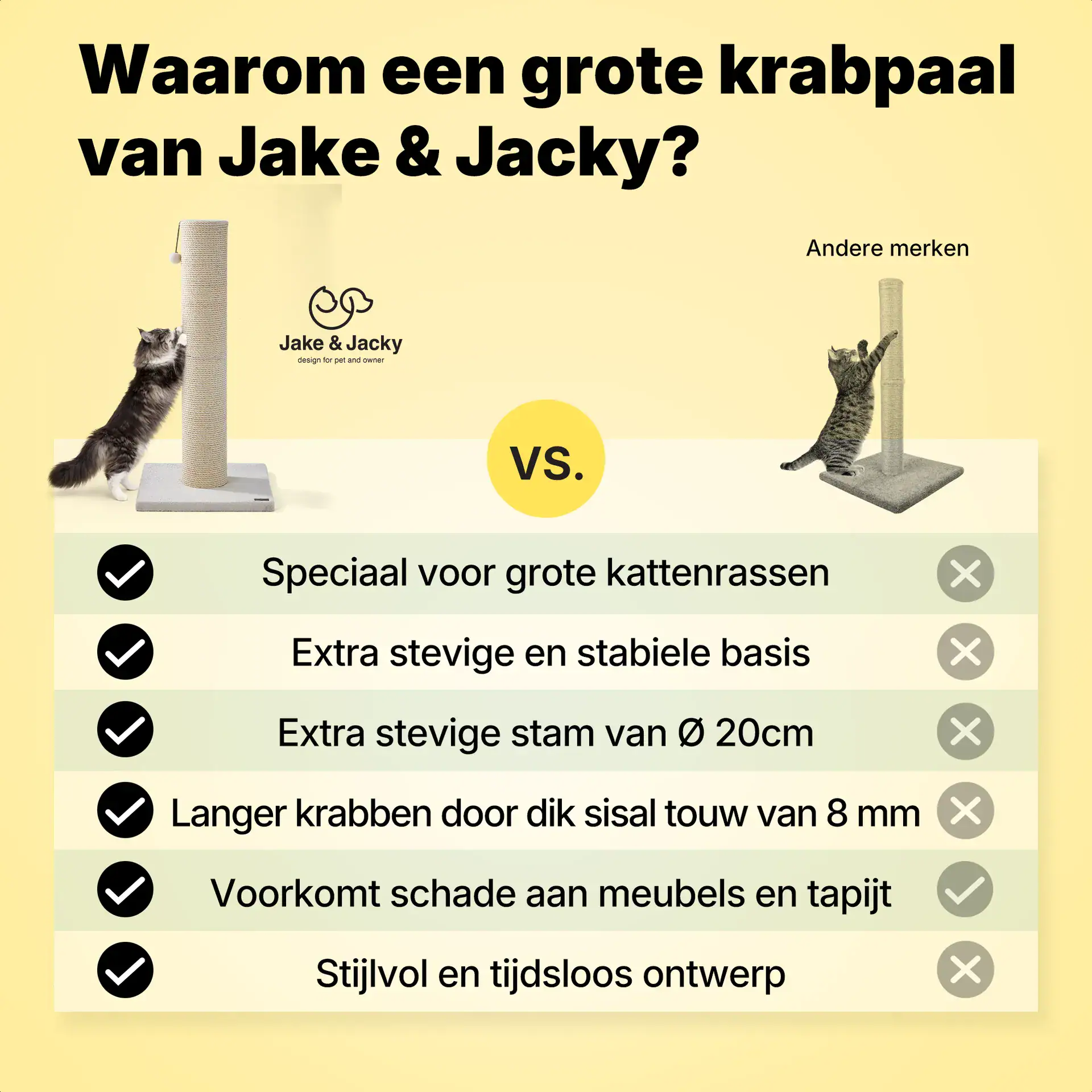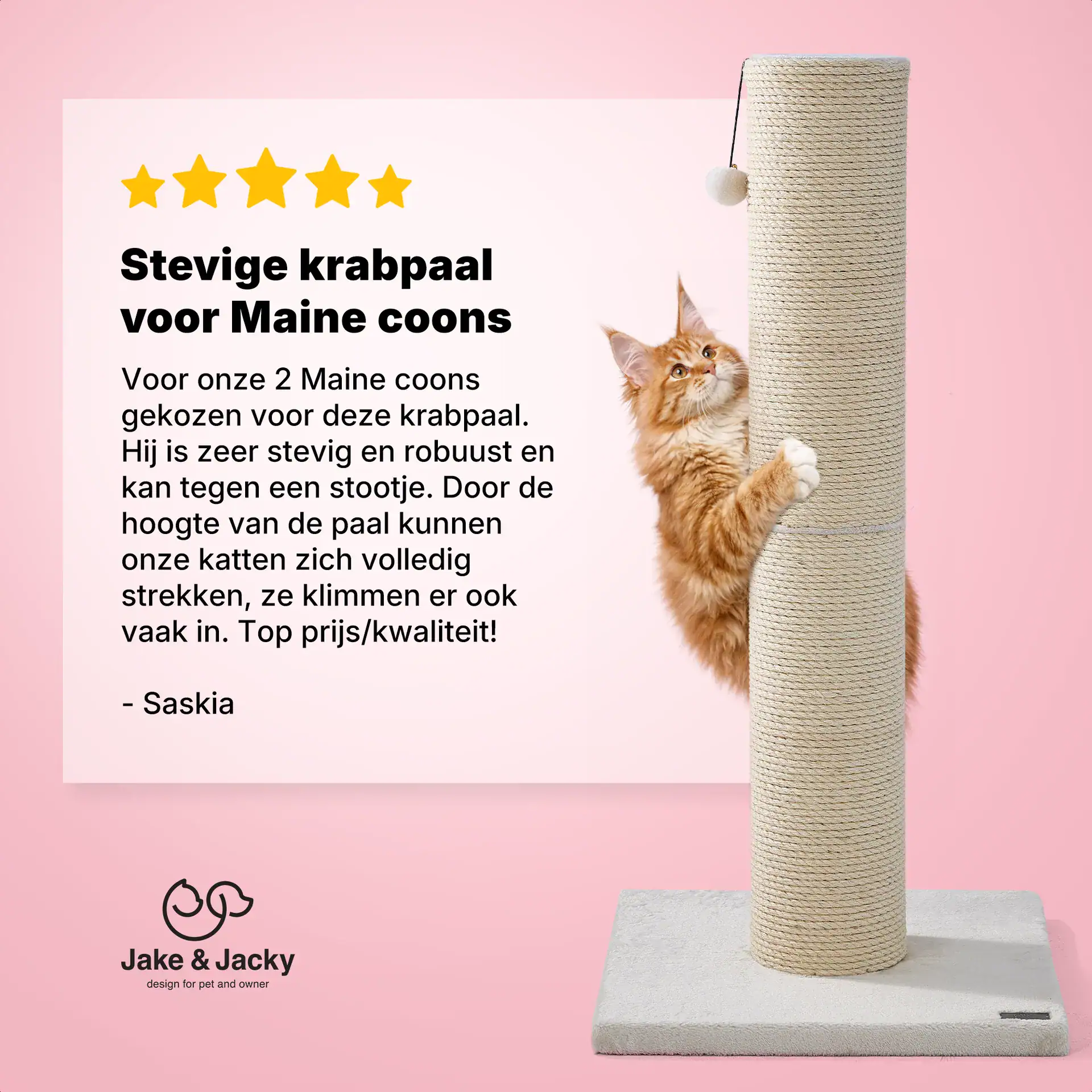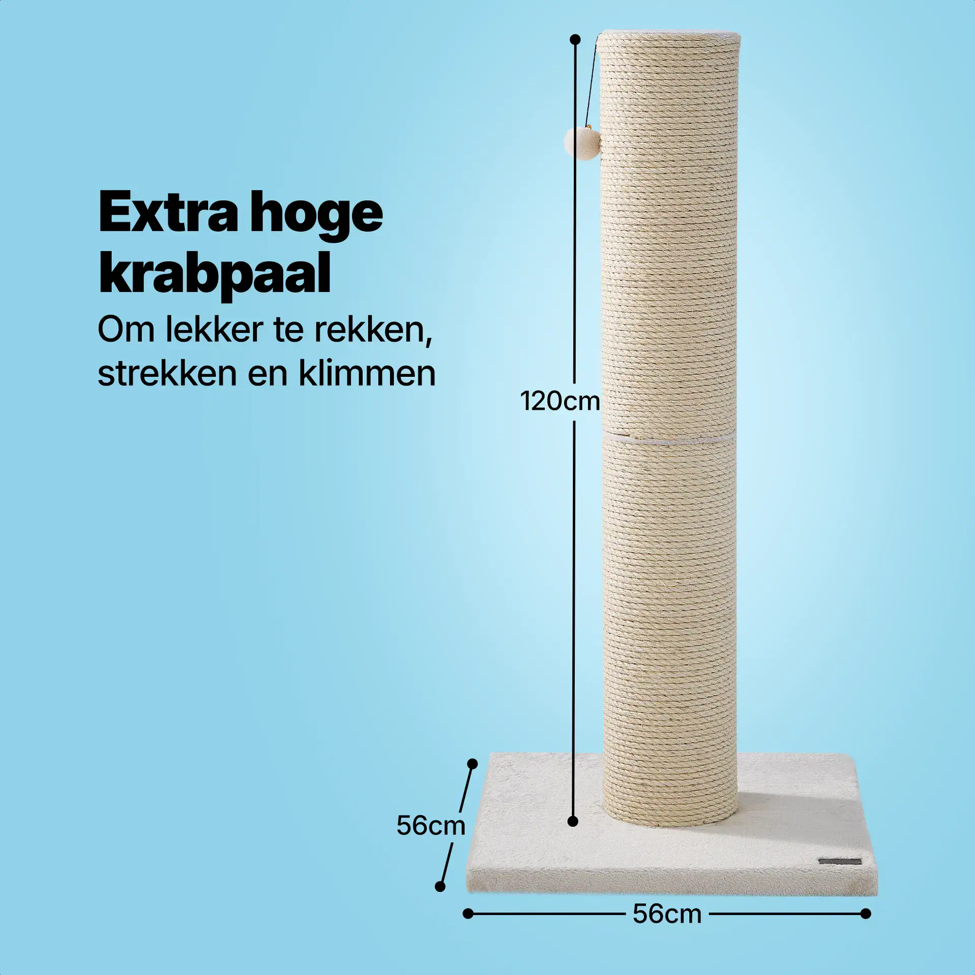 Kies voor grote kattenrassen ook voor een grote en stevige krabpaal waar jou kat(ten) aan kan krabben en in kan klimmen. Met deze extra grote en hoge krabpaal (120 cm) van Jake & Jacky zal het aan krabplezier in ieder geval niet ontbreken. Dankzij de verzwaarde bodemplaat van 56×56 cm is deze krabpaal zeer stabiel en geschikt voor meerdere katten.