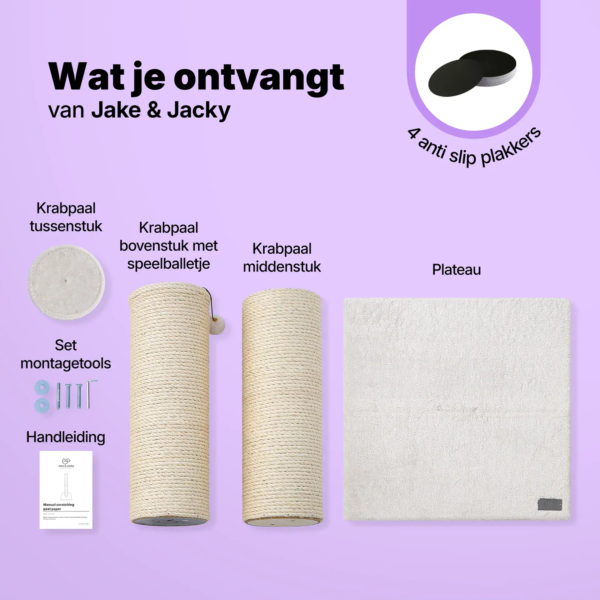 1 plateau, 1 krabpaal bovenstuk met speelballetje, 1 krabpaal middenstuk, 1 krabpaal tussenstuk, set montagetools, handleiding