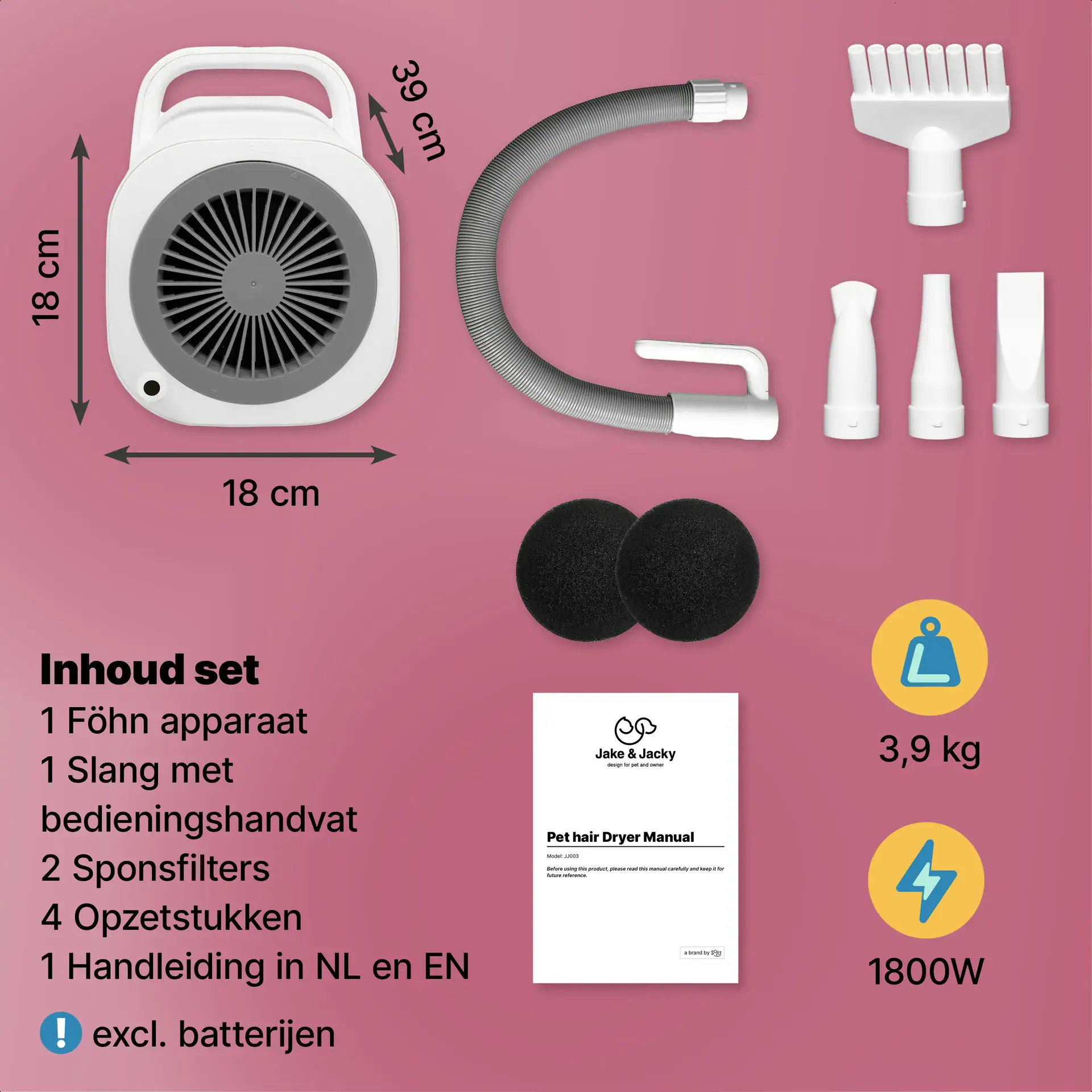 Stoor jij je ook zo aan vieze poten in huis na een lekkere wandeling of rondvliegende spetters na een zwembeurt of na het wandelen in een regenbui? Met de professionele hondenföhn van Jake & Jacky is dat verleden tijd. Blaas jouw harige vriend weer helemaal droog, schoon en zacht, net zo snel en gemakkelijk als in een hondensalon. De waterblazer bedien je eenvoudig met het smart design handvat en met de 4 opzetstukken heb je voor ieder lichaamsdeel een geschikte keuze.