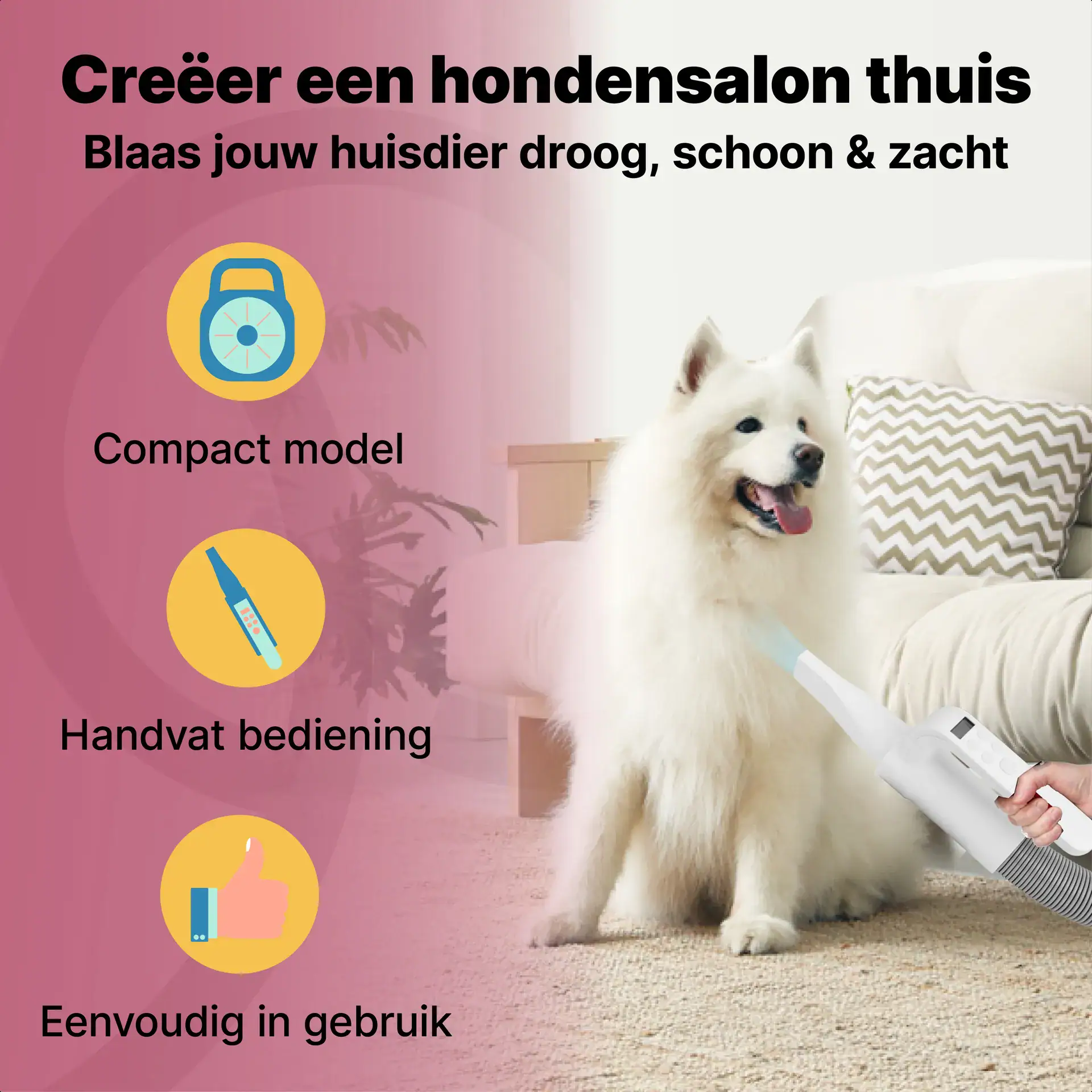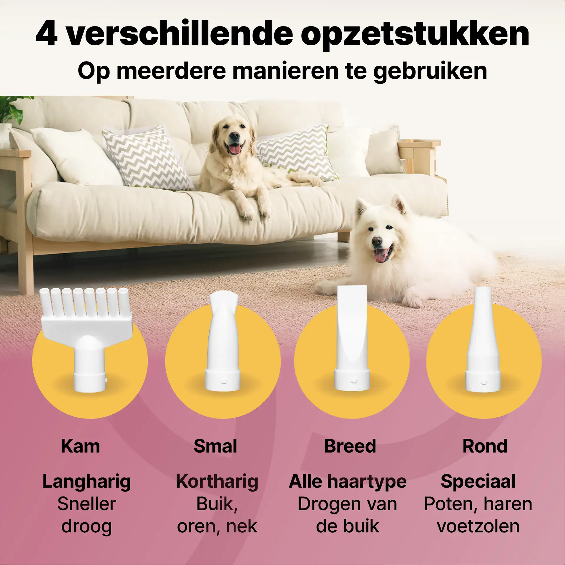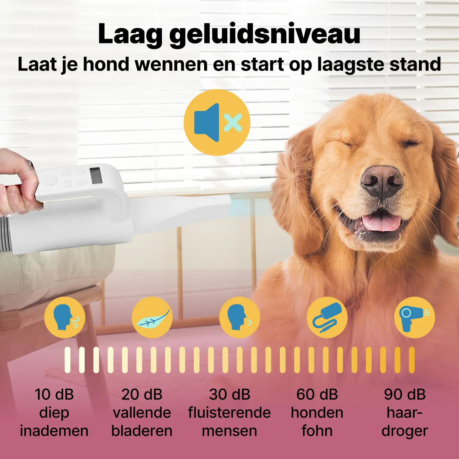 Tip: sommige huisdieren zullen ondanks het lage geluidsniveau toch moeten wennen aan het geluid van de föhn. Ons advies is om altijd bij de laagste stand te beginnen en dit rustig op te bouwen. Beloon naar wens!